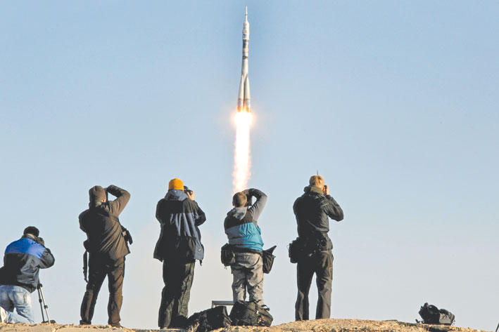 أقلعت مركبة سويوز روسية أمس من كازاخستان حاملة ثلاثة رواد فضاء والشعلة الأولمبية، التي ستكون لها محطة في الفضاء للمرة الأولى في التاريخ، حسبما أظهرت المشاهد التي نقلها التلفزيون الروسي. وانطلق رواد الفضاء، الروسي ميخائيل تيورين، والأميركي ريك ماستراكيو، والياباني كويشي واكاتا، قرابة الساعة 04.14 بتوقيت غرينتش من مركز بايكونور الفضائي، وسط سماء صافية في المركبة، التي حملت شعار أولمبياد سوتشي (جنوب روسيا)، الذي يقام في فبراير 2014 والدوائر الأولمبية الخمس.وقبل الصعود الى المركبة المتوجهة الى محطة الفضاء الدولية التقطت صور لكل رائد، على حدة، وهو يحمل الشعلة الحمراء والرمادية أمام الصحافيين.