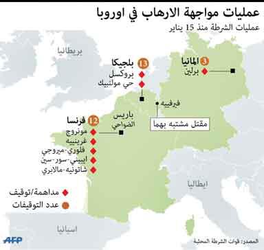 وضعت قوات الأمن البلجيكية في حالة تأهب قصوى أمس، بعد قتلها مسلحين اثنين عادا من سورية، مؤخرا، في إطار عدة مداهمات استهدفت شبكة إسلاميين يشتبه في أنهم يدبرون هجمات وشيكة، في وقت شهدت فرنسا.