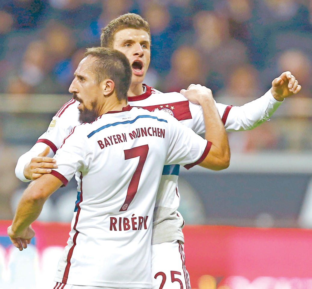 سجل توماس مولر ثلاثية أبعدت بايرن ميونيخ حامل اللقب سبع نقاط مؤقتا عن أقرب منافسيه، بفوزه الصريح على مضيفه إينتراخت فرانكفورت 4 - صفر أمس، في المرحلة الحادية عشرة من الدوري الألماني لكرة القدم.على ملعب «كومرتسبانك إرينا» وأمام 51500 متفرج، حسم بايرن الشوط الأول بهدف الدولي مولر على دفعتين، بعد عرضية «مقشرة» من الفرنسي فرانك ريبيري (22).