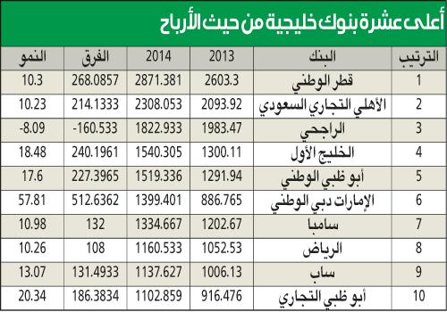 حققت البنوك الخيجية نمواً في ارباحها بلغ 13.85 في المئة خلال عام 2014 لترتفع من 26.6 مليار دولار في 2013 إلى 30.30 مليار دولار بزيادة بلغت 3.68 مليارات دولار، حيث استحوذت البنوك السعودية على حصة الاسد من اجمالي ارباح البنوك الخليجية بنسبة 34 في المئة، تلتها البنوك الاماراتية بنسبة 33 في المئة، ثم بنوك قطر بنسبة 17.7 في المئة، فبنوك الكويت بنسبة 7.3 في المئة ثم بنوك البحرين بنسبة 5.4 في المئة، وأخيرا بنوك عمان بنسبة 2.6 في المئة.الأعلى نمواً