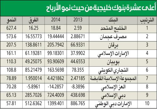وأظهرت احصائية اعدتها «الجريدة» عن البيانات المالية للقطاع المصرفي في دول الخليج خلال عام 2014، تصدر البنوك الاماراتية قائمة الاعلى نمواً في الربحية على مستوى دول الخليج خلال عام 2014، محققه 10.017 مليارات دولار مقارنة مع نتائج العام الماضي والتي بلغت 7.69 مليارات دولار بارتفاع بلغ 30.24 في المئة تلتها بنوك الكويت بنسبة نمو 24.63 في المئة لترتفع من 1.766 مليار دولار إلى 2.202 مليار دولار ثم بنوك قطر بنسبة نمو 12.2 في المئة لترتفع من 4.77 مليارات دولار إلى 5.35 مليارات دولار.وجاءت بنوك عمان في المرتبة الرابعة بنسبة 3.6 في المئة لتزيد من 772 مليون دولار إلى 799.8 مليون دولار، وارتفعت بنوك البحرينية من 1.584 مليار دولار إلى 1.638 مليار دولار بنسبة نمو 3.45 في المئة، وحققت البنوك السعودية أقل نمو بنسبة 2.57 في المئة لترتفع من 10 مليارات دولار إلى 10.29 مليارات دولار.«الخليج المتحد» ومن حيث الاعلى نمواً في الارباح تصدر «الخليج المتحد»، بنسبة نمو 627 في المئة، تلاه مصرف عجمان بنسبة 573.6 في المئة، ثم بنك برقان بنسبة 207.5 في المئة وبنك الامارات الاسلامي بنسبة 161.1 في المئة، وبوبيان بنسبة 110.3 في المئة والتجاري الكويتي بنسبة 108.8 في المئة.وجاء بنك قطر الوطني الاعلى تحقيقاً للارباح بـ2.871 مليار دولار، تلاه البنك الأهلي التجاري السعودي بـ2.3 مليار دولار، ثم الراجحي بـ1.822 مليار، وبنك الخليج الاول بـ1.540 مليار دولار، وبنك أبوظبي الوطني بـ1.52 مليار دولار، ثم بنك الامارات دبي الوطني بـ1.4 مليار دولار وسامبا بـ1.33 مليار دولار، وبنك الرياض بـ1.16 مليار دولار، ثم ساب بـ1.13 مليار دولار، وأخير بنك ابوظبي التجاري بـ1.1 مليار دولار.بنوك الكويتمن جانبها، أكدت مصادر مصرفية أن البنوك الكويتية اثبتت قدرتها على قيادة باقي البنوك الخليجية في الارباح لعام 2014 خاصة مع بوادر التحسن الذي شهدتها خلال العام، مشيرة إلى أن تخفيف قبضة البنوك المركزية الخليجية على التشدد في اجبار البنوك على أخذ مخصصات، كان له الأثر في زيادة ارباحها، خاصة وان بعض البنوك ارتفعت نسبة تغطيتها للديون المتعثرة بشكل كبير، مما حقق لها الاكتفاء من بناء مخصصات جديدة، مؤكدة أن خفض المخصصات يعطي مؤشرا قويا على تحسن أوضاع البنوك الخليجية مع الدعم الحكومي المستمر لها.وتوقعت المصادر أن يشهد عام 2015 طفرة حقيقية على مستوى الكويت بشكل خاص والخليج بشكل عام، في توسعات البنوك بأنشطة التمويل بدخولها في تمويل المشاريع الحكومية التي اعلنت عنها بعض الحكومات الخليجية وفي مقدمتها الكويت، التي زادت وتيرة طرح المشاريع التنموية المدرجة في خطة التنمية، ومع تأكيدات من سمو رئيس مجلس الورزاء ووزير المالية بقيام الحكومة بطرح عدد كبير من المشاريع خلال هذا العام، وهو ما سيظهر على ارباح البنوك خلال الفترات المالية القادمة.