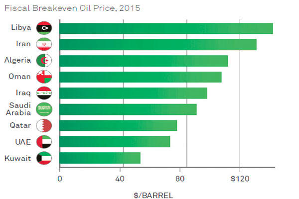 كم سعر توازن النفط لميزانيات كبار منتجي الشرق الأوسط عام 2015؟