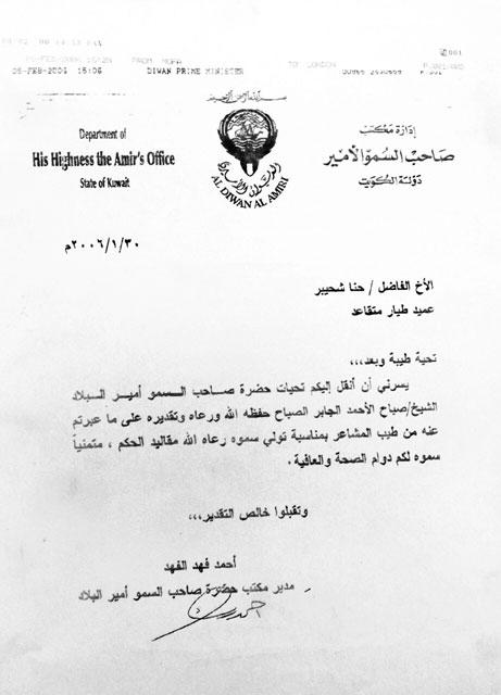 بذكريات عديدة لا تنسى لدى أهله وجميع من عرفه، تمر الذكرى التاسعة لوفاة الطيار «آمر قسم سلاح النقل الجوي» حنا شحيبر، الذي حلّق بعيداً عن سماء الدنيا في 15 مارس 2006، بعد رحلة مشرفة حافلة بالأحداث، ندمت على عدم معرفتي به، ولم أكن لأعرفه لولا صداقتي مع ابنته رانيا، التي تعرفت منها ومن باقي أسرتها الكريمة على تلك الشخصية الجديرة بالاحترام.هل سبق لك أن شعرت أنك تعرف شخصاً تمام المعرفة من فرط ما يتحدث عنه المقربون بكثير من الحب، حتى بعد رحيله؟ كنت أشعر بمعرفتي له تمام المعرفة، شعرت بضحكاته وقدرته على التقليد، وحبه لأبنائه ودعمه غير المحدود لإخوانه وعائلته.لذا ثار فضولي كي أعرف عنه المزيد، هو طيار كويتي من أصل فلسطيني، من أقلية مسيحية، وهو واحد من أهم الطيارين الحربيين، عاش وطار مصطحباً معه عديداً من الشخصيات المهمة، لعل أهمها سمو أمير البلاد الشيخ صباح الأحمد حينما كان وزيراً للخارجية.قصة حياته مثيرة للاهتمام وجديرة بالبحث، وتستحق أن يتعرف عليها شباب اليوم.طفولتهولد شحيبر في 25 ديسمبر عام 1937 في القدس، ولكن عائلته هاجرت إلى الكويت عام 1948، غير أنها أرسلت حنا للدراسة في مدرسة داخلية بلبنان حيث كان عمره 11 عاما، فدرس هناك ما يقارب الست سنوات، ليكتسب من دراسته هناك العديد من الهوايات، لعل أهمها حبه للرياضة، ومن هنا بدأ حبه للمغامرة، ما كان سبباً على الأغلب في حبه واتجاهه إلى الطيران.وبعد تلك السنوات التحق بأهله في الكويت، ودرس المرحلة الثانوية بثانوية الشويخ، وكان أهم مدرسيه الشاعر الكويتي المعروف أحمد العدواني.التحاقه ببدايات الطيرانفي الكويتفي عهد الشيخ عبدالله المبارك، رحمه الله، تم افتتاح نادي الطيران، وكان المدربون من مصر وبريطانيا، وذلك حينما استشعر الشيخ عبدالله المبارك التطور الذي طرأ على الطيران بعد الحرب العالمية الثانية مع دخول الكويت مرحلة جديدة ورغبتها في بناء مؤسسات الدولة الحديثة، التي منها الجيش، فأحس بحاجة الكويت الماسة إلى وجود قوة جوية لحماية الأجواء الكويتية. وانطلاقاً من هذا، افتتح المرحوم الشيخ عبدالله المبارك أول مدرج طيران في تاريخ الكويت لاستقبال الطائرات المروحية، حيث كان تديره شركة «إنترناشونال راديو ليمتد»، وكان يتبع لدائرة الأمن العام بقيادة المبارك نفسه، وكان هذا المطار بدائياً ومدرجه رملياً يدار نهاراً، وإمكاناته بسيطة وطاقمه لا يتعدى 12 موظفاً في البداية، وعرف لاحقاً باسم مطار النقرة، وكما يعرف أيضاً بمطار النزهة.التحق شحيبر عام 1952 بنادي الطيران، وكان معه في هذه الدورة 12 طياراً، لعل أشهرهم مرزوق العجيل، وبعد اجتياز الامتحان الأول كانت رحلاتهم إلى عبدان.وفي عام 1954 أمر الشيخ عبدالله المبارك بإرسال الدفعة الأولى من نادي الطيران إلى بريطانيا، لإكمال تدريبها للحصول على شهادة الطيران التجاري في مدرسة الطيران في مدينة هامبل، وضمت تلك الدفعة، إضافة إلى حنا شحيبر، كلاً من مرزوق العجيل، وغازي القدومي، وبدر الصايغ، وعبدالله صالح العلي، وفهد العتيقي، وداود مرزوق البدر، وعبدالله السمحان.ورغم رفض والدته دخوله هذا المجال لخوفها عليه، كان شغف حنا بالطيران عظيماً، لذا لم يستطع أن يكبح جماح طموحه، بل امتدت العدوى إلى أخيه باسم، الذي أصبح هو أيضاً طيار الأمير الراحل الشيخ صباح السالم.كانت دفعة شحيبر هي الدفعة الأولى التي يتم إرسالها إلى الخارج، حيث درست الطيران التجاري، وحين عاد شحيبر إلى الكويت التحق بدورة عسكرية في القوات المسلحة للتدريب العسكري، ليحلق بعدة طائرات، ومنها الطائرة النفاثة، والهليكوبتر، إلى جانب طائرة تابعة لسلاح الطيران.في عام 1959 تطور سلاح الطيران في الكويت، واستحضروا طائرات نفاثة مما تعادل (بوينغ 337)، وكان شحيبر رئيس وحدة التنقل الجوي، وتنقل كثيراً في هذه الفترة بين فرنسا ودول الشرق الأوسط.كان معروفا بحرصه ودقته، وقد يرجع ذلك إلى حادثة شهيرة حدثت له في مطار الكويت، هي عدم إنزال عجلات الطائرة، وكان يقودها الكاب