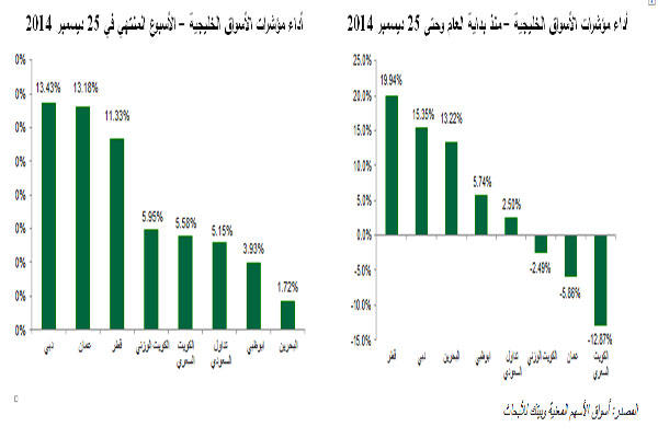 قال تقرير صادر عن شركة «بيتك للأبحاث» التابعة لمجموعة بيت التمويل الكويتي (بيتك)، إنه بعد 4 إلى 5 أسابيع من الأداء السلبي، انتعشت أسواق الأسهم الخليجية مع تسجيل بعض الزيادات الحادة. وشوهد الأداء الإيجابي في معظم القطاعات بالأسواق الخليجية، وذلك على اثر الأنباء الإيجابية من المملكة العربية السعودية، التي تتضمن إبقاء مستويات الإنفاق مرتفعة في ميزانية عام 2015، وهو ما يطمئن المنطقة أن النمو الاقتصادي لن يتضرر كثيراً بانخفاض أسعار النفط.في غضون ذلك، حصلت الأسواق على مزيد من الدعم من الاستقرار المؤقت في سعر خام النفط برنت فوق سعر 60 دولاراً للبرميل.تخفيضات كبيرةوكانت جميع أسواق الأسهم الخليجية تراجعت خلال الأسابيع القليلة الماضية، بسبب المخاوف من أن يدفع انخفاض إيرادات صادرات النفط حكومات الخليج لتقليص مشروعات التنمية، وهو ما سيضر بالتالي بأرباح الشركات. لكن اصبح من الواضح الآن انه من المستبعد حدوث تخفيضات كبيرة في الإنفاق مع احتمال استثناء البحرين وعمان.وكانت مخاوف المستثمرين بشأن خفض الحكومات في المنطقة للإنفاق السبب الرئيسي وراء حالة الذعر وعمليات جني الأرباح في الفترة الماضية، الأمر الذي قضى على جميع المكاسب منذ بداية العام في معظم الأسواق الخليجية في وقت سابق من هذا الشهر. إلا أن عمليات الشراء عادت بقوة يوم الأحد، وتسببت في ارتفاع حجم التداول إلى أعلى مستوى له في الأشهر في جميع أسواق الأسهم الخليجية. أما في 23 ديسمبر (الثلاثاء)، فأعلنت الولايات المتحدة بيانات قوية جداً لنمو الناتج المحلي قد تعجل بتوقيت بدء مجلس الاحتياطي الاتحادي (البنك المركزي الأميركي) في رفع أسعار الفائدة خلال العام القادم، وهو ما يجبر البنوك المركزية في دول مجلس التعاون الخليجي التي تربط عملاتها بالدولار على اتباع النهج نفسه.إلا أنه مع ذلك، وفي الوقت الراهن يرى المستثمرون على ما يبدو أن النمو الأميركي السريع إيجابي للطلب العالمي على العقارات في دبي.مع نهاية الأسبوع، اتخذ كل من مؤشر سوق دبي المالي، ومؤشر سوق مسقط للأوراق المالية زمام المبادرة في الأسواق الخليجية لهذا الأسبوع بعد إضافة 13.43 في المئة و13.18 في المئة إلى قيمتها، على التوالي، وهي أكبر زيادة أسبوعية لكل منهما منذ بداية السنة. وفي عُمان، أبلى السوق بلاء حسناً بعد أن عزز الصندوق الاحتياطي العام للدولة، أكبر صندوق ثروة سيادي في السلطنة، شراء الأسهم في السوق المحلي في أعقاب تراجع أسعار الأسهم إلى مستويات مغرية.وفي السعودية، السوق الأكبر في المنطقة، تمكن السوق من استرداد المكاسب للعام وتحول إلى الإيجابية مرة أخرى، بعد أن تراجع مؤشر السوق (تاسي) للمنطقة الحمراء منذ 10 ديسمبر. وقد ارتفع المؤشر السعودي بنسبة 5.15 في المئة خلال الأسبوع، وأغلق عند مستوى 8.749.34 نقاط.احتياطيات ضخمةوجاءت هذه الزيادة بعد أن توقعت خطة الميزانية السعودية انفاقا قياسيا مقداره 860 مليار ريال (230 مليار دولار) خلال العام القادم، أي ما يزيد 0.6 في المئة عن خطة ميزانية عام 2014. وأعلنت المملكة كذلك أنه ستتم تغطية عجز في الميزانية قيمته 145 مليار ريال من الاحتياطات الحكومية الضخمة، مما يعني أن المملكة ستستمر في الإنفاق الكثيف على التنمية الاقتصادية.في غضون ذلك، أنهى سوق الكويت للأوراق المالية خمسة أسابيع من التراجع، ليسجل أقوى انعكاس أسبوعي له في الاتجاه الصعودي هذا العام بدعم من ارتفاع حجم التداول. وقضت الزيادة القوية على كل خسائر الأسبوع الماضي، وتركت المؤشر قرب مستواه في 10 ديسمبر.وأنهى مؤشر الكويت السعري الأسبوع الثالث من التراجع، وكان قادراً على الارتفاع، مسجلا أكبر زيادة أسبوعية في نحو خمس سنوات بإضافته 5.58 في المئة إلى قيمته ومقفلا جلسة الخميس عند مستوى 6.577.81 نقاط.وقد قلص المؤشر السعري خسائره منذ بداية العام إلى 12.87 في المئة كما في 25 ديسمبر 2014. أما مؤشر الكويت الوزني فقد أغلق مرتفعا بنسبة 5.95 في المئة عند مستوى 441,59 نقطة الخميس، وهو أكبر مكسب أسبوعي له منذ 18 فبر