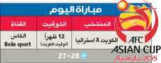 في افتتاح بطولة كأس آسيا التي تستضيفها أستراليا، يلتقي المنتخب الوطني الأول لكرة القدم نظيره الأسترالي الساعة 12 ظهر اليوم، بتوقيت الكويت.ويأمل الجهاز الفني للأزرق، بقيادة التونسي نبيل معلول في ظهوره الرسمي الأول بعد توليه قيادة المنتخب خلفاً للبرازيلي جورفان فييرا، الظفر بنقاط المواجهة الثلاث، للدخول في أجواء المنافسة على حجز إحدى بطاقتي التأهل لدور الثمانية عن المجموعة الأولى.