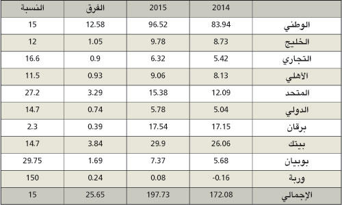 ● «وربة» و«بوبيان» و«المتحد» الأعلى نمواًحققت البنوك المحلية العشرة نموا إيجابيا في صافي أرباحها خلال الربع الأول من عام 2015، بنمو 15 في المئة عن نفس الفترة العام الماضي، لترتفع من 172.08 مليون دينار في الربع الأول من 2014 إلى 197.7 مليونا، بزيادة بلغت 25.65 مليونا.واستحوذ «الوطني» على نصيب الأسد من اجمالي أرباح القطاع بنسبة بلغت 48.8 في المئة، تلاه بيت التمويل الكويتي بنسبة 15.1 في المئة، ثم بنك برقان بنسبة 8.87 في المئة، وبنك الأهلي المتحد بنسبة 7.77 في المئة، ثم بنك الخليج بنسبة 5 في المئة، والبنك الاهلي بـ4.6 في المئة، وبوبيان بنسبة 3.72 في المئة، والتجاري بـ3.2 في المئة، والدولي بنسبة 2.9 في المئة، وأخيرا بنك وربة بنسبة 0.04 في المئة. ومن حيث أعلى نمو تصدر بنك وربة باقي البنوك بنسبة 150 في المئة، تلاه بنك بوبيان بنسبة 29.75 في المئة، ثم بنك الأهلي المتحد بنسبة 27.2 في المئة، والبنك التجاري بنسبة 16.6 في المئة، و»الوطني» بنسبة 15 في المئة، وتساوى نمو «بيتك» مع «الدولي» بنسبة 14.7 في المئة، وبلغ نمو بنك الخليج 12 في المئة، والأهلي بنسبة 11.5 في المئة.نمو واضح من جانبها، عزت مصادر مصرفية هذا النمو الواضح في نتائج البنوك إلى أنه يأتي في ظل تحسن واستقرار البيئة التشغيلية، وزيادة صافي إيرادات التشغيل ونمو الائتمان، مع انخفاض تدريجي في إجمالي المخصصات مقارنة بالسنة الماضية.وتوقعت المصادر ان تنخفض نسبة بناء المخصصات خلال 2015 بشكل كبير مقارنة بالأعوام الماضية، لافتة إلى الآلية الجديدة التي اتبعها «المركزي في طلب المخصصات من البنوك، حيث يطلب منها المخصصات التقديرية لها في بداية الفترة المالية، ما أعطى أريحية للبنوك في عدم الضغط على نتائجها المالية».وأوضحت ان نسبة القروض المتعثرة انخفضت نتيجة تحسن البيئة التشغيلية ونجاح الشركات المتعثرة في السداد، إضافة لعمليات شطب بعض القروض المتعثرة، وعمليات التسويات وتسييل أصول لدفع المديونيات، وهي أمور صبت في النهاية في مصلحة تنظيف المحفظة الائتمانية للبنوك.مخصصات قويةوأضافت المصادر أن البنوك نجحت، خلال الأعوام التي تلت الازمة المالية، في تكوين مخصصات قوية جعلتها قادرة على مواجهة السيناريوهات الأصعب، نتيجة التزامها بتعليمات وضوابط البنك المركزي الذي حرص على رفع درجة الأمان لديها مع اندلاع الأزمة.وألمحت إلى أن هذا الأداء يعد امتدادا لأداء البنوك خلال 2014، حيث ارتفع إجمالي أرباحها من 538.04 مليون دينار في 2013 إلى 661.29 مليونا، بزيادة 123.25 مليونا، وبنسبة نمو بلغت 23 في المئة.وأشارت إلى ان توزيعات البنوك هذا العام كانت لافتة مقارنة بالأعوام السابقة، حيث بلغ إجمالي التوزيعات النقدية للبنوك نحو 332.62 مليون دينار بنمو 30.8 في المئة عن العام الماضي التي بلغت فيه 254.28 مليونا بزيادة 78.33 مليونا. وزادت ان البيئة التشغيلية أصبحت أفضل، رغم المنافسة الشديدة بين البنوك لزيادة حصتها في السوق المحلي، من خلال استقطاب عملاء جدد، خصوصا في قطاع الأفراد والقطاع الاستهلاكي، مبينة ان أغلب البنوك أعلنت خلال عموميتها قدرتها على تمويل مشروعات خطة التنمية، ومنها ما أكد قدرته على تمويل بعض المشاريع منفردا، ومنها ما طرح إمكانية دخول بنكه ضمن كونسورتيوم للفوز بتمويل هذه المشاريع.