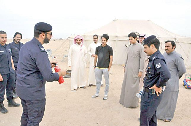 نظم فريق من الإدارة العامة للإطفاء حملة توعية لمرتادي البرّ شمالي الكويت أمس، من خلال التجمُّع عند النقطة الأمنية بمنطقة برّ المطلاع، من ثمّ القيام بجولة في بعض المخيمات، بهدف توعية مرتاديها بمخاطر الحرائق التي يمكن أن تحدث في الخيم، وكيفية تفادي مثل هذه الحوادث والوقاية منها.وقدَّم الفريق شرحاً لأهالي المخيمات عن أنواع مطفآت الحريق، وتولَّى تدريبهم على كيفية استخدامها، علاوة على توزيع مطفآت الحريق وأجهزة كاشف الدخان عليهم، إضافة إلى البروشرات الإرشادية التي تتضمن الشرح الكافي لكيفية الوقاية من الحريق.