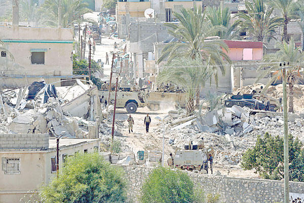 في محاولة لمنع تهريب الأسلحة وتسلل الجهاديين بعد «مذبحة كرم القواديس» التي أسفرت عن مقتل 30 جندياً، بدأ الجيش المصري أمس إقامة منطقة عازلة على الحدود مع قطاع غزة الفلسطيني بإخلاء منازل مئات الأسر في مدينة رفح شمال سيناء.وأكد محافظ شمال سيناء اللواء عبدالفتاح حرحور، في مؤتمر صحافي، أن الإخلاء يجري لشريط حدودي عمقه 500 متر وطوله 13 كيلومتراً، مبيناً أنه تم الانتهاء حتى عصر أمس من إخلاء 802 منزل تقطنها 1156 أسرة.
