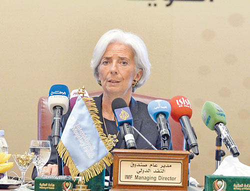 وأوضح أن هناك دراسة متكاملة حول ترشيد الدعم سيتم عرضها على مجلس الامة، وعندها سيتم الوصول إلى اتفاق موضوعي لتحقيق الهدف من ذلك الاجراء، وسيكون النقاش والبحث في ضوء الدراسة التي سينجزها المجلس الاعلى للتخطيط بشأن الكهرباء والتي سيتم عرضها على نواب مجلس الامة.وعن اجراءات الحكومة لمواجهة تراجع اسعار النفط قال إن "تراجع الاسعار بنسبة تزيد على 25 في المئة خلال شهرين له اثر بلا شك على المالية العامة، ونحن نراقب عن كثب تطورات اسعار النفط، ولن تتأثر المشاريع المدرجة في الميزانية، ونعمل حاليا على وضع وتنفيذ استراتيجية بعيدة المدى لتصحيح المسار الاقتصادي، وفي حالة استمرار تراجع اسعار النفط فإن هناك اصلاحات اقتصادية لا إجراءات".وحول تأثير تراجع النفط على الفوائض المالية للدولة أضاف ان الكويت تعتمد في ايراداتها بنسبة 95% على النفط، وتراجع الاسعار سيؤثر بشكل كبير على الفوائض المالية للدولة، مبينا ان نزول النفط بنسبة 25% سيؤثر على مسار هذا الفائض اذا استمر التراجع بنفس الوتيرة.وبشأن تخارجات الحكومة من حصصها في بعض البنوك والشركات المدرجة في سوق الكويت للاوراق المالية، ذكر "انه ليس هناك ما يسمى بالخصخصة، وانما بيع بعض الاسهم في شركات مملوكة للهيئة العامة للاستثمار".اقتراحات «الصندوق»من جهتها، ذكرت المديرة العامة لصندوق النقد الدولي كريستين لاغارد أن صندوق النقد قدم عدة اقتراحات إلى دول مجلس التعاون الخليجي في ما يتعلق بأسلوب التعامل مع انخفاض اسعار النفط بنسبة تصل إلى 25 في المئة، اهمها ضرورة تبني مجموعة من الاطر والسياسات المالية تركز على الايرادات والنفقات العامة ضمن الميزانية متعددة السنوات، خاصة ما يتعلق بجانب الانفاق الرأسمالي، والا يؤثر ذلك على المشاريع المدرجة في تلك الميزانية بغض النظر عن تذبذب اسعار النفط.وقالت لاغارد انه من الضروري تشجيع القطاع الخاص على زيادة قدرته التنافسية خارج حدود الدولة، وان تقوم الدولة بتمويل انشطة غير تقليدية مثل التصدير، وان يكون هناك اهتمام بالشباب من حيث تبني نظام تعليمي حقيقي وجيد ومتفق مع احتياجات اسواق العمل، فهناك اعداد كبيرة من الخريجين يريدون الالتحاق بالقطاع العام إلا ان التوجه لتبني نظام تعليمي جيد يدفعهم للدخول بقوة إلى القطاع الخاص.وحول توقعات النمولدول مجلس التعاون الخليجي، أضافت ان النموفي دول مجلس التعاون يتراوح بين 4 و5 في المئة خلال 2015 على مستوى الاقتصاد كله، وتصل معدلات النموللقطاعات غير النفطية إلى 6 في المئة سنويا مدفوعا بمشروعات البنية التحتية التي سيتم تدشينها في تلك الدول.وعن توقعاتها لمعدلات النموفي الناتج المحلي الاجمالي مع استمرار تراجعات اسعار النفط، افادت بأن تلك التراجعات تم وضع نماذج رياضية في حال استمرارها، لافتة إلى انه في حال انخفاض السعر إلى 25 دولارا فسيؤدي إلى تراجع الناتج الاجمالي حوالي 8%، الامر الذي يؤدي إلى حدوث عجز مالي في بعض دول مجلس التعاون الخليجي.ولفتت إلى ان هناك تحديات تواجه دول مجلس التعاون، ابرزها التوترات السياسية والنزاعات المسلحة في بعض بلدان الشرق الاوسط، وتراجع اسعار النفط بنسبة 25 في المئة خلال الشهرين الماضيين، بما يؤثر على الماليات العامة والحساب الخارجي لدول الخليج.إجراءات إصلاحيةوبينت لاغارد ان هناك هوامش مالية وقائية ساعدت دول المجلس على مواجهة تلك التحديات، مشيرة إلى ان تلك الدول مطلوب منها تعزيز اجراءات الاصلاح الاقتصادي للتحوط تجاه تلك المخاطر، وتلك الاجراءات تتمثل في ضبط اوضاع الميزانية وترشيد وحوكمة السياسات المالية المتمثلة في تنويع مصادر الدخل، والابتعاد عن النفط كمصدر وحيد مع تنويع سوق العمل، والتحول إلى القطاع الخاص، مشددة على ضرورة تضييق الهوة بين القطاعين الخاص والعام، وتشجيع "الخاص" على الدخول في قطاعات غير تقليدية.وبشأن تأثير تراجعات اسعار النفط على اسواق الاسهم الخليجية والقطاع العقاري قالت إنه "لا يتم وضع توقعاتنا بشكل لحظي اوشهري، ب