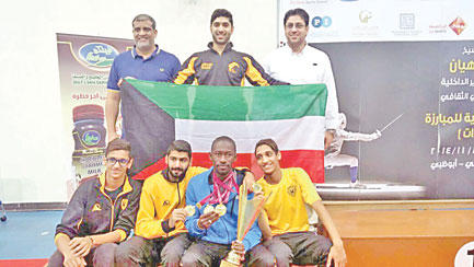 فاز فريق مبارزة السابر بنادي القادسية بذهبية فرق الرجال في بطولة الاندية العربية، التي اختتمت امس في ابوظبي، تحت رعاية نائب رئيس مجلس الوزراء الاماراتي وزير الداخلية الشيخ سيف آل نهيان، وحل نادي الشباب في المركز الثاني ونال الميدالية الفضية.وضم فريق القادسية كلا من بندر ويوسف الشملان واحمد مهدي ومحمد كاظم، بينما ضم فريق الشباب خالد وسالم الشملان وعبدالله الشمالي وعبدالله الخياط.
