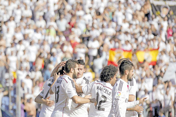 واصل ريال مدريد مهرجاناته التهديفية ونجمه رونالدو ارقامه القياسية، بفوزه الكاسح على مضيفه ليفانتي 5 - صفر على ملعب «سيوداد دي فالنسيا» وأمام 24 الف متفرج امس في المرحلة الثامنة من الدوري الاسباني لكرة القدم.وتابع رونالدو هوايته في هز الشباك ودخل تاريخ الليغا بتسجيله ثنائية في مباراة اليوم رافعا رصيده الى 15 هدفا حتى الآن، وبات اول لاعب في تاريخ الليغا يسجل 15 هدفا في 8 مراحل، علماً ان الدولي البرتغالي لعب 7 مباريات فقط في الليغا هذا الموسم، لأنه غاب عن المباراة امام ريال سوسييداد (4-2) بسبب الاصابة.