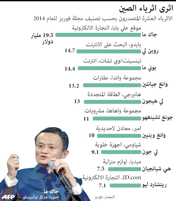 وخسر وانغ جيالين، الرئيس التنفيذي لشركة «واندا» للخدمات الترفيهية، موقعه على رأس القائمة، وتراجع إلى المركز الرابع.وأظهرت بيانات التصنيف لـ «فوربس» أن إجمالي عدد المليارديرات في الصين ارتفع إلى 242، مقابل 168 في عام 2013.وكان «ما»، مدرس اللغة الإنكليزية السابق، قد أسس شركته منذ 15 عاما. وتبلغ قيمة شركة «علي بابا» أكثر من 240 مليار دولار.وينظر إلى «ما» على أنه رائد صناعي يتحكم في أكثر من 80 في المئة من سوق التجارة الإلكترونية المهم في الصين. وكان جاك ما قد احتل في وقت سابق من هذا العام المركز الأول على قائمة الأغنياء في الصين، وفقا لترتيب مجلة «هورون»، ومقرها الصين، التي قدرت ثروته بأكثر من 25 مليار دولار.وحل روبين لي، مؤسس شركة «باديو» لخدمات الإنترنت الشهيرة باسم «غوغل الصين»، في المركز الثاني بصافي ثروة بلغ 14 مليار دولار، مقابل 11 مليارا العام الماضي.واحتل ما هواتينغ، مؤسس شركة «تنسينت»، أكبر شركة لخدمات الإنترنت في الصين، المركز الثالث.وتعد «تنسينت» الشركة الأم لأكثر تطبيقات الرسائل شهرة في الصين، وهو تطبيق «وي تشات».وقفزت الثروة الشخصية لهواتينغ، الشهير كذلك باسم بوني ما، من إلى 14 مليار دولار من 10 مليارات العام الماضي.(بي بي سي)