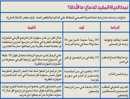 ولكن إن أردت أن تبذل جهوداً إضافية لتفادي فقدان الذاكرة، فعليك أن تنظر إلى الصورة الكاملة. يوضح الدكتور هسو: {لا يقتصر الأمر على التمرن والغذاء، بل يجب أن تكون أيضاً نشيطاً فكرياً واجتماعياً. لا يساعد هذا ذاكرتك فحسب، بل مزاجك أيضاً}.على سبيل المثال، تخيل أنك تجري حواراً حماسياً مع الأصدقاء في مناسبة اجتماعية، ثم تقومون للرقص. لا شك في أن هذا أكثر فائدة بكثير من الجلوس من دون حراك طوال ساعة وأنت تتسلى بلعب تدريب الدماغ على جهاز الكمبيوتر. يقول الدكتور هسو: {عش حياة غنية، فتغذي بالتالي دماغك}.ماذا يقول العلم؟تصوغ الحياة التي تعيشها الدماغ الذي يرافقك فيما تتقدم في السن. ولا تستند هذه الفكرة إلى المنطق، بل تدعم أبحاث كثيرة هذا المبدأ. قام الدكتور هسو وزميله الدكتور غاد مارشال، بروفسور مساعد متخصص في علم الأعصاب في كلية الطب في جامعة هارفارد، أخيراً بجردة شاملة عن أفضل الأبحاث العلمية حتى اليوم عن الوقاية من مرض الألزهايمر. لاحظا أن عشرات الدراسات المنشورة التي تأملوا فيها تقدم فيضاً من الأدلة عن أن نمط الحياة يسهم بشدة في الحد من خطر فقدان الذاكرة.ولكن ثمة تحذير مهم. اكتفى معظم الدراسات الكبيرة والطويلة على مراقبة مجموعات من الناس على مر الوقت لمعرفة مَن يعيش حياة صحية ويتمتع أيضاً بمهارات فكرية. لكن هذه الدراسات التي تقوم على المراقبة لا يمكنها أن تثبت على نحو قاطع أن نمط الحياة يحافظ على وظائف الذاكرة.تكشف التجارب السريرية العشوائية المضبوطة الأسباب، وثمة مثال ممتاز واحد وارد في المنشورات الطبية. يُدعى هذا المثال دراسة لياقة الدماغ المتقدم في السن. تناولت الدراسة تأثير التمرن في وظائف الدماغ في حالة 170 شخصاً في الخمسين من عمرهم أو أكبر سناً. بدأ المشاركون في الدراسة بملاحظة التغييرات في ذاكرتهم، إلا أنهم ظلوا ضمن المدى الطبيعي عند إجراء الاختبارات. اختير نصفهم عشوائياً للقيام بثلاث جلسات من التمارين المعتدلة أسبوعياً (المشي عادةً) مدة كل منها 50 دقيقة طوال ستة أشهر. نتيجة لذلك، تحسنت نتائجهم في مجموعة من اختبارات المهارات الفكرية.أسس صحة الدماغ ولكن عند النظر إلى صحة الدماغ عموماً، تشير الأبحاث إلى توجيهات منطقية:• حد من المخاطر القلبية الوعائية: حافظ على ضغط دم صحي، كما ينصحك طبيبك. أبقِ معدل الكولسترول ضمن المدى المحدد.• تناول غذاء صحياً: يكون معظم أنظمة الغذاء الصحية غنياً بالفاكهة والخضروات، مع كمية محدودة من اللحوم والنشويات المعالجة، مثل الخبز، المشروبات المحلاة بالسكر، والحلوى.• تمرن بانتظام: يبلغ المقدار الحالي الموصى به راهناً 150 دقيقة من التمارين الجسدية المعتدلة الحدية أسبوعياً. وتشمل هذه المشي، التمارين في صالة الرياضة، والنشاط الجسدي خلال العمل أو في أوقات الفراغ.• أبقِ دماغك منشغلاً. تُعتبر الهوايات، المطالعة، وغيرهما من نشاطات تحفز الدماغ وسيلة تحفيز فكري. ولا شك في أن قاعدة «استخدمه أو تخسره» صحيحة.• ابق نشيطاً اجتماعياً. يتمتع مَن يظلون على اتصال مع عائلتهم، الأصدقاء، والمجتمع بصحة أفضل.• يعود نمط الحياة الذي يعزز لياقة الدماغ بفائدة كبيرة على الرجال الذين يواجهون خطر الإصابة بنوبة قلبية أو سكتة دماغية. يذكر الدكتور هسو: {المفيد للدماغ مفيد أيضاً للقلب. ثمة تداخل كبير بين فقدان الذاكرة وبين الأمراض القلبية الوعائية}.أخيراً، لا يقلل البقاء حاد الذهن التقدم في السن فحسب، بل يعزز تفادي داء الألزهايمر، السبب الرئيس للخرف بين المسنين. من حسن الحظ أن أنماط الحياة الصحية ذاتها التي تسهم في الحفاظ على المهارات الفكرية عموماً ترتبط أيضاً بالحد من خطر الخرف.
