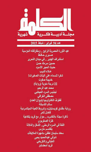 ويتطرق العدد إلى آداب الآخر المماثل، فيقدم رواية للكاتب الأفغاني عتيق رحيمي، ورواية الكاتبة الباكستانية كاملة شمسي. ناهيك عن متابعة عدد من الروايات العربية من لبنان والعراق ومصر. كذلك جاء العدد حافلاً بمواد نقدية وإبداعية، ومهتماً بالفن التشكيلي في حوار مع أحد أعلامه في المغرب، ومقالة عن سيكلوجية الألوان.يقدم العدد رواية جديدة، جاءت هذه المرة من مصر، إضافة إلى مجموعة قصصية من العراق، وديوان شعر من مصر. ينطوي العدد على دراسات أدبية ونقدية تطرح قضايا عدة أو تتابع بالتحليل والمسح والتمحيص منجزات الإبداع العربي من شعر ورواية ومساراته؛ مع مزيد من القصائد والقصص، وأبواب {الكلمة} المعهودة من دراسات وشعر وقص وعلامات ونقد وكتب ومواجهات ورسائل وتقارير وأنشطة ثقافية.عيد الثورةفي {عيد الثورة المصرية الرابع... ومفارقاته المؤسية} يكتب رئيس تحرير {الكلمة}، الناقد الدكتور صبري حافظ، عن اختلاط الأوراق في العيد الرابع للثورة المصرية، فبدا ميدان التحرير خالياً من المحتفلين ومثيراً للرثاء... وساد خطاب مغلوط يشوه الثورة، ويمهد لعودة غير ميمونة للنظام القديم.يسعى الباحث المغربي مصطفى الغرافي في دراسته «تجنيس السرد العجائبي» الى استعراض الدراسات التي تناولت العجائبي وتجنيسه نظرياً انتهاء ببلورة أسس «تقاليد» معينة رسخها ارتباطه بالجنس الأدبي.ويقدم الناقد العراقي فاضل تامر قراءة تحليلية لـ{رواية فندق كويستيان» وشروط اللعبة الميتاسردية»، فيما يختار الباحث المغربي مراد ليمام أن يقدم «مدخلاً تأسيسياً» لقضايا الهوية والتحيز اللغوي»، ويتناول الباحث التونسي بلقاسم مارس «اللغة في السرد الرحلي... الشكل والدلالة» من خلال روايات عبدالرحمان منيف، وينشر الناقد العراقي حسين سرمك حسن في الذكرى الرابعة لثورة 25 يناير المغدورة دراسة «استشراف الهدير... في ميدان التحرير». كذلك تنشر «الكلمة» الجزء الثاني من دراسة الباحثة السودانية خديجة صفوت عن انتهاك الرأسمالية المالية المنظم للطفولة في دراسة وسمتها بـ{شكرا للسماء على البنات الصغيرات»، ويكتب الناقد المغربي فريد أمعشطو عن «الخيالي والتاريخي».في باب «شعر» تنشر الكلمة للشاعر المصري سالم الشبانة ديوان «قطوف التكنولوجيا»، وتنشر قصائد للشعراء: هاتف الجنابي، ونيس المنتصر، فتح الله بوعزة، حسن العاصي، مروة أبو ضيف، عبدالسلام الشبلي. أما في باب «السرد» فنقرأ رواية «22 درجة مئوية» للروائي المصري محمد عبدالرحيم تكشف طبيعة مجتمعات الكبت الاجتماعي، ومجموعة قصصية للمبدع العراقي نهار حسب الله بعنوان «جنون الضحك»، الى جانب نصوص المبدعين: سلام ابراهيم، ليلى بارع، ياسر المحمدي، راينه ماريا ريلكه، عبدالواحد الزفري.في باب «النقد» يتناول الباحث المصري خليل كلفت «الثورة الشعبية بين سياقين تاريخيين مختلفين» والتحول الاجتماعي والسياسي، فيما يقارب مصطفى قمية «العزلة» ويمر على تجلياتها، ويستبين الكاتب محمد أنقار «كناية قتل الأم» في مقاله «الكتابة وقتل الأم»، ويتبين الكاتب سعيد بوخليط «كيف يمكن حقا للتصوف، دحض التطرف»، ويقربنا الباحث أحمد غريب من ظاهرة التسجيلات المسربة في «متعة التلصص السياسي»، ويكتب الباحث اللبناني أحمد بيضون في «نقل فؤادك» عن علاقة الأتوبيوغرافي بالتخييل الذاتي، في حين يسطر زياد عبدالله حزنه لرحيل السينمائية أسماء البكري والتي وسمها بالساخرة النبيلة، واختار عبدالكريم سليم علي «سيكولوجية الألوان» كي يسبر أغوار اللون في التطور الحضاري، وعن «فلسفة مبسطة: الديالكتيك» يستقصي نبيل عودة طرح الأسس الفكرية العامة بلغة سلسلة، وعن ماهوية السماري وهويته يبحث عدنان الظاهر، فيما تتجه قراءة سحر عبدالله إلى {ظلال محترقة} للروائية الباكستانية كاملة ناهيد شمسي.في باب «علامات»، يكتب السينمائي ناصر كامل في «ولادة نجمة» عن سيرة الفنانة فاتن حمامة، والتي ودعتنا أخيراً، كاستثناء دال في التاريخ الفني العربي. ويعود باب «مواجهات» إلى حو
