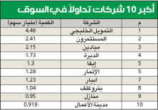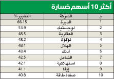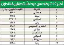 وعزت المصادر الانخفاض الذي جرى منذ بداية أكتوبر الجاري إلى سيطرة الحالة الاقتصادية السياسية العالمية على حركة السوق، نتيجة انخفاض أسعار النفط، إضافة إلى التخبط الحاصل نتيجة فكرة طرح الحكومة أسهمها في الشركات القيادية للاكتتاب العام، وتعرضها للضغط نتيجة حالات البيع استعدادا لعملية الاكتتاب، وإعلان هيئة الاستثمار إرجاء الأمر بعد أيام، إضافة إلى طول فترة عطلة عيد الأضحى التي امتدت 9 أيام.وأضافت أن بعض الأسهم القيادية حظيت بعمليات دعم، نتيجة أسعارها المغرية، وأهمها البنوك التي أعلنت أرباحا جيدة عن فترة أداء التسعة أشهر الماضية، مشيرة إلى أن بعض الأسهم لاتزال أسعارها دون المستوى العادل، وهناك فرص جيدة للاستثمار فيها، علما أن الفترة المقبلة تعتبر فترة ترقب لإعلانات نتائج الشركات التي على ضوئها سيتم تحديد توجهات المستثمرين حتى نهاية العام الجاري.الأكثر ربحاً وأعدت «الجريدة» إحصائية لأكبر 10 شركات ارتفاعا على مستوى أسعارها السوقية، وهي كالتالي: التمدين العقارية 113.07%، التمدين الاستثمارية 98.5%، ميادين 87.5%، هيومن سوفت 76.09، دلقان العقارية 70.18%، يليها شركة إياس 58.8%، البناء 53.4%، العيد 52.5%، الخليجي 52.08%، الاتحاد العقارية 48.15%.أما أكبر 10 شركات تعرضت أسهمها للانخفاض منذ بداية العام فهي الديرة 66.15%، لوجستيك 53.9%، العقارية 48.5%، لؤلؤة 48.2%، الهلال 48.1%، تلتها شركة أدنك 43.4%، الشامل 42.5%، استهلاكية 42.1%، ثم شركة ايفا 41.1%، صفاة طاقة 40.8%.الأنشط قيمةوجاء البنك الوطني في مقدمة أكبر 10 شركات في قيمة التداول، حيث جرت عليه تداولات بقيمة 444.6 مليون دينار، ثم بيتك 419.5 مليونا، وأجيليتي 279.12 مليونا، زين 238.8 مليونا، بيت التمويل الخليجي 212.4 مليونا، برقان 164.7 مليونا، ثم مشاريع 126.8 مليونا، المباني 100.5 مليون، بتروغلف 98.5 مليونا، وربة 89.2 مليونا.في المقابل، احتل سهم بيت التمويل الخليجي المركز الأول في مقدمة أكثر الشركات تداولا، حيث بلغت كمية الأسهم المتداولة 4.46 مليارات سهم، المستثمرون 2.417 مليار، ميادين 2.15 مليار، الديرة 1.73 مليار، ايفا 1.3 مليار، الإثمار 1.28 مليار، وجاء بعدها سهم ابيار بكمية بلغت 1.23 مليار سهم، بتروغلف 1.04 مليار، منازل 950 مليونا، مدينة الأعمال 919 مليونا.