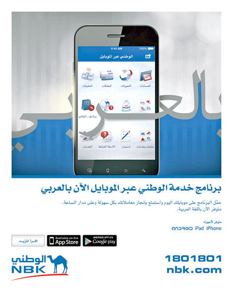 وأضاف العثمان أن عملاء البنك الوطني، بات بإمكانهم الاستمتاع بمزايا وخدمات تطبيق خدمة «الوطني عبر الموبايل» باللغة العربية، والتعرّف على الخدمات المجانيّة الجديدة التي توفرها هذه الخدمة. وأوضح أن «الوطني عبر الموبايل» تستقطب عشرات الآلاف من المستخدمين، الذين يستفيدون من خدماتها المتعددة، لما فيها من مزايا سهلة ومرنة، تجنّبهم عناء الانتظار، وتتيح لهم تنفيذ عملياتهم المصرفية في أي وقت، ومن أي مكان.وذكر أن هذه الخدمة تتوفر على مختلف الأجهزة الذكية مثل «أندرويد» و»أبل» و»بلاك بيري» لتكون بمتناول الجميع مهما تنوّعت وتعدّدت استخداماتهم، وتعزّز جسور التواصل معهم، وتستجيب لاحتياجاتهم في كل الأوقات وأينما تواجدوا.وبيّن أن بإمكان عملاء البنك الوطني الاستفادة من الخيارات والخدمات الجديدة المبتكرة على تطبيق «الوطني عبر الموبايل»، مثل خيار اللغة العربية، والتّعرف على العروض والمحلات المشاركة في برنامج مكافآت الوطني وخيار الكاميرا التفاعلية لتحديد المواقع، والتّعرف على مواقع أجهزة الإيداع النقدي الجديدة، إلى جانب مواقع السحب الآلي والفروع ومواعيد عمل كل منها المتوفرة سابقاً.وأشار العثمان إلى أن ذلك يضاف إلى إنجاز المعاملات المصرفية التي تشمل الاطلاع على رصيد الحساب، والبطاقة الائتمانية، وتحويل الأموال داخل الكويت وخارجها، وتقديم طلب للحصول على دفتر شيكات، وكشف حساب، وتسديد فواتير البطاقات الائتمانية، وفواتير الهاتف النّقال، وغيرها من الخدمات المختلفة.