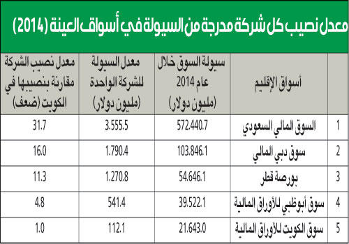 السوق الكويتي هو الأدنى سيولة مقارنة بأربعة أسواق متوسطة أو كبيرة في الإقليم، فسيولته في عام 2014 كانت 54.8 في المئة من سيولة سوق أبوظبي، و39.6 في المئة من سيولة السوق القطري، و20.8 في المئة من سيولة سوق دبي، و3.8 في المئة من سيولة السوق السعودي».