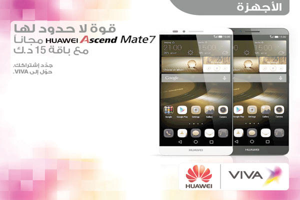 أعلنت شركة الاتصالات الكويتية VIVA، مشغل الاتصالات الأسرع نمواً في الكويت طرح أحدث الهواتف الذكية «Ascend Mate 7» من شركة هواوي لعملائها المشتركين في باقات الخدمات الصوتية الآجلة الدفع مانحة إياهم فرصة اختبار كل ما تقدمه تجربة الهواتف الذكية بأسعار تنافسية.وسيتسنى لعملاء VIVA المشتركين بباقات الخدمات الصوتية للدفع الآجل الاستمتاع بهاتف هواويAscend Mate 7 مجاناً عند الاشتراك بباقة 15 دينارا كويتيا. وتتطلع VIVA دائماً إلى منح عملائها كل ما هو جديد ومبتكر في عالم الاتصالات وتحرص على تخطي توقعاتهم. وهذا العرض الجديد والحصري هو خير مثال على هذا.
