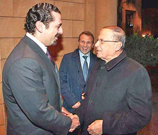 استقبل الرئيس سعد الحريري مساء امس الأول في بيت الوسط رئيس «تكتل التغيير والإصلاح» النائب العماد ميشال عون يرافقه وزير الخارجية جبران باسيل وعقد معه اجتماعا في حــــــضـــــور الـنـــائــــب الــــســـــابـــــــــــق د. غطاس خوري، وجرى عرض لمجمل الأوضاع السياسية في البلاد وآخر المستجدات الإقليمية. واستكمل البحث على مائدة عشاء أقامها الرئيس الحريري على شرف العماد عون.وقالت مصادر متابعة ان «عون ابدى انفتاحاً غير مسبوق على الحريري خصوصاً بعد الحوار الجاري بين المستقبل وحزب الله والحوار الجاري أيضا بين التيار الوطني الحر والقوات اللبنانية». وأضافت المصادر أن «الغزل السياسي بين عون و(رئيس حزب القوات سمير) جعجع وكلام عن لقاء قريب بينهما، وتعويل عوني على أن يبادر جعجع الى تأييد ترشيح عون سهل عملية التلاقي بين عون والحريري»، لافتة إلى ان «اللقاء تطرق إلى مجمل الأوضاع السياسية في لبنان والمنطقة ولم يستثن موضوع الشغور الرئاسي».
