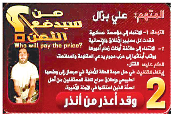 بعد تضارب في الأنباء وتشكيك في صحة إعلان "جبهة النصرة" مساء أمس الأول قتل الجندي اللبناني محمد حمية (شيعي)، نشرت "النصرة" أمس شريطاً مصوراً يظهر إعدام الجندي حمية برصاصة في الرأس، وإلى جانبه الجندي علي البزال وهو يناشد أهله التحرك وإلا فسيُعدَم.وفي الشريط المصور، دعا البزال اللبنانيين الى الضغط على "حزب الشيطان" في إشارة الى "حزب الله" للخروج من سورية، و"وقف التحريض على أهل السنة"، على حد قوله. وكانت وكالة "الأناضول" التركية للأنباء نقلت مساء أمس الأول عن قيادي في "النصرة" إعلانه أن الجبهة أعدمت الجندي حمية. وذكرت الجبهة، عبر حسابها على "تويتر"، أن "ﻣﺤﻤﺪ ﺣﻤﻴﺔ ﺃﻭﻝ ﺿﺤﻴﺔ ﻣﻦ ﺿﺤﺎﻳﺎ تعنت ﺍﻟﺠﻴﺶ ﺍﻟﻠﺒﻨﺎﻧﻲ، ﺍﻟﺬﻱ ﺃﺻﺒﺢ ﺃﻟﻌﻮﺑﺔ بيد ﺍﻟﺤﺰﺏ ﺍﻹﻳﺮﺍﻧﻲ"، في إشارة إلى "حزب الله".