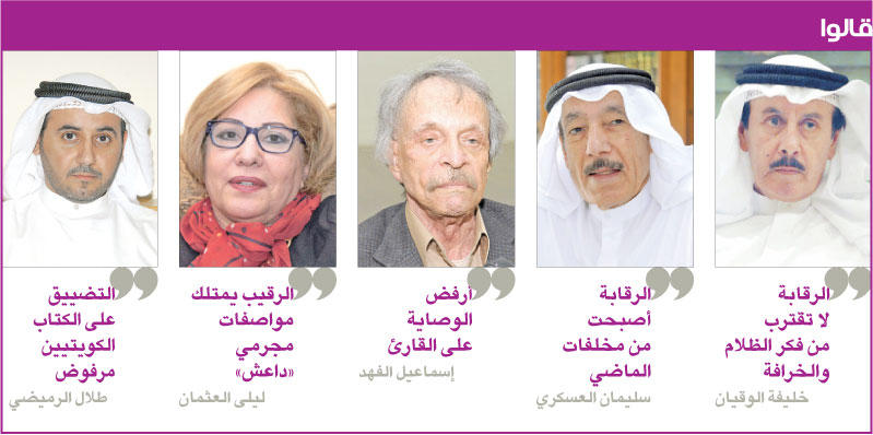 وبموازاة هذا الاحتجاج ورفض الوصاية الفكرية، أرسلت رابطة الأدباء الكويتيين خطاباً إلى الوكيل المساعد لقطاع المطبوعات في وزارة الإعلام عقب صدور قرار منع رواية «الورد لك... والشوك لي»، تعبر فيه عن رفضها التشدد الرقابي، وضرورة إعادة النظر في قرار منع الرواية.واستغرب الأمين العام لرابطة الأدباء طلال الرميضي تضييق الرقابة على الكتاب الكويتيين، وتضاعف قرارات المنع من لجنة مراقبة المطبوعات.وفي تعليق على التعسف الذي تمارسه رقابة الإعلام، أكد عدد من الأكاديميين والمثقفين رفضهم هذه الوصاية الفكرية، معتبرين ما يجري تشويهاً لسمعة الكويت الثقافية.ضمن هذا السياق، قال الدكتور خليفة الوقيان: «إن ما نحتاج إليه هو عدم التعدي على الدستور الذي كفل الحريات كافة، حرية الاعتقاد، وحرية البحث العلمي، وحرية الرأي».وبدوره، أكد الدكتور سليمان العسكري أن الرقابة بكل صورها وتنوعاتها أصبحت من مخلفات الماضي، ومن يتصور أنه يملك حق المنع والمصادرة خاصة للفكر والأدب والكلمة والفن، هو شخص إما مكابر أو هو لا يعيش الزمن الحاضر.وانتقدت الأديبة ليلى العثمان ما يجري، مبينة أن «داعش» ليست وحدها من تنحر الرقاب وتريق الدماء، وليست وحدها من تلاحق من لا يؤمن بما لا تؤمن به من تخاريف واحتيالات على الدين، فهناك رقابة (داعش) أخرى لا تقطع الرؤوس، بل تقطع رؤس الأقلام وتجلد بسيفها أبطال الأعمال الأدبية.ومن جهته، قال الأديب إسماعيل الفهد إنه ضد الرقابة على الكتابات الأدبية، رافضاً الوصاية على المجتمع وتحديد ما يقرأ وما يطلع عليه الأفراد، في حين استغرب الأمين العام لرابطة الأدباء الكويتيين طلال الرميضي تضييق الرقابة على الكتاب الكويتيين، وتضاعف قرارات المنع في الفترة الأخيرة.التعدي على الدستوروفي مفتتح حديثه، قال الدكتور خليفة الوقيان: "قلت أكثر من مرة إن القول بوجود هامش كبير للحرية في الكويت وهمٌ كبير. إن من يطالعون الصحف الكويتية، ويرون فيها نقداً عنيفاً للمسؤولين يظنون أن تلك هي الحرية المنشودة. إن ما نحتاج إليه هو عدم التعدي على الدستور الذي كفل الحريات كافة، حرية الاعتقاد، وحرية البحث العلمي، وحرية الرأي. ثم جاءت القوانين واللوائح والتصرفات الشاذة فطوقت تلك الحريات، وصادرتها.وأضاف: "ليس بإمكان المفكرين والباحثين وأصحاب الرأي معالجة القضايا الكبرى المتعلقة بوجودنا ومصيرنا، لأنها محاطة بسور منيع من الروادع والموانع والمحاذير".وتابع: "وفي السنوات الأخيرة ازداد الأمر سوءاً حتى إن الأعمال (فنون تشكيلية، روايات، شعر) أصبحت محلاً للشك في مضامينها والتأويل الساذج لمجازاتها، والخوف من ملامستها جدار الفضيلة المزعومة في نظر قيادات الدولة.ويحدد الوقيان أسباب تدهور الوضع بقوله: "إنها مشكلة جهل بمفهوم الإبداع، وقصور في قراءته، فضلاً عن عدم الإيمان بالحريات التي كفلها الدستور، وفي مقدمتها البحث العلمي. إن المصدر الوحيد الذي لا تقترب منه الرقابة هو فكر الظلام والخرافة ولذلك نجده يتفشى في مجتمعنا، ويقضي على مكتسباتنا، ويفسد أجيالنا التي نعقد عليها الآمال في التطور ومواكبة العصر".مستوى الرقيبوفي السياق ذاته، قال الدكتور سليمان العسكري إن الكتابات الأدبية كالقصة والرواية والفنون كافة والنصوص الأدبية هي إنتاج وإبداع لمواهب ومفكرين وأدباء وفنانين مروا بمراحل طويلة من المعاناة والقراءة والتحصيل اللغوي العميق، وتنقلوا في قراءاتهم بين الأدب والشعر والرواية والفلسفة وعلم النفس وفنون الكتابة، واطلعوا بالتأكيد على كم واسع من آداب الأمم الأخرى بلغات أجنبية على مدى سنوات طويلة، مما أهلهم بعد القراءة والمعاناة من هضم ما حصلوا عليه لأن يكتبوا وينشروا أفكارهم ورؤاهم لواقعهم المحلي والعربي والعالمي، وصاغوه، كل حسب الفن الذي اختاره، لينشر من خلاله بلغتهم وتصورهم، معالجين واقعهم الإنساني ورؤيتهم لهذا الواقع. وأضاف العسكري أنه لابد لمن يتصدي لتقييم إنتاج أولئك المبدعين أن يكون في مستواهم الثقافي على 