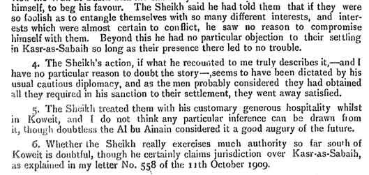 وتوضح هذه الوثيقة أن البوعينين هم الذين بنوا الوكرة عند استقرارهم فيها منذ عقود طويلة من الزمان، ثم هاجروا منها تجنباً لإراقة الدماء ليستقروا في عينين التي كانت موطنهم الأصلي قبل انتقالهم إلى الوكرة والبحرين. ويبدو أن الوفد الذي ذهب لمشاورة الشيخ عبدالله أبوبكر الملا كان يريد أن يحصل على إعفاء من العثمانيين من دفع ضريبة سنوية مدة خمس سنوات، إضافة إلى مطالب أخرى مهمة.وفي ما يتعلق بالسؤال الذي أرسلته المعتمدية البريطانية في الخليج إلى المعتمدية في الكويت، بخصوص موقف الشيخ مبارك من وضع قصر الصبيح أو عينين، عثرت من بين وثائق الأرشيف البريطاني على وثيقة كتبها المعتمد البريطاني في الكويت بيرسي كوكس في مذكراته للأسبوع المنتهي بتاريخ 16 أكتوبر 1910م، تتحدث بشيء من التفصيل عن لقاء تم بين الشيخ مبارك الصباح ووفد من عشيرة البوعينين في ذلك الوقت. يقول كوكس في تقريره إن الشيخ مبارك استقبل البوعينين وأكرمهم غاية الإكرام مدة ثلاثة أيام، وعند مناقشة حالهم وأوضاعهم كان الشيخ مبارك صريحاً وواضحاً في موقفه معهم، ووافق على استقرارهم في قصر الصبيح. وإليكم جزءاً من النص الذي قمت بترجمته: "قال الشيخ مبارك إن الرجال (من عشيرة البوعينين) أتوا طلباً لحمايته وإنه ناقشهم في أوضاعهم،...... وقال الشيخ لهم إنه إذا تصرفوا بحكمة ولم يدخلوا في صراعات مع أصحاب المصالح حولهم فإنه ليس لديه مانع في استقرارهم في قصر الصبيح إذا لم يؤد ذلك إلى أية مشاكل".ويعلق كوكس على ذلك فيقول إن موقف الشيخ مبارك "أملته عليه دبلوماسيته الحذرة"، ويعلق على موقف البوعينين فيقول إن "الرجال اعتبروا أنهم حصلوا على مطلبهم بخصوص الموافقة على الاستقرار" في ذلك المكان، لكنه يثير شكوكاً حول إمكانية الشيخ مبارك "ممارسة نفوذه في تلك المنطقة رغم تمسكه بسيادة حكمه على قصر الصبيح".يقول الكاتب لوريمر في كتابه "دليل الخليج" إن قصر الصبيح قرية في ولاية الحسا، على بعد 4 أميال من الساحل، في منتصف الطريق بين الجبيل ورأس الدفي، وتتكون من القصر الأصلي، وهو محاط بسور وحصن وثلاثمئة وخمسين كوخاً من سعف النخل".وبهذا المقال نختتم هذه السلسلة من المقالات عن هجرة البوعينين من الوكرة في قطر إلى عينين (قديماً) أو الجبيل (حالياً) التي تمت في نهاية شهر سبتمبر وبداية شهر أكتوبر عام 1909م، وكان عدد الرجال من البوعينين حوالي 1000 رجل، قاموا ببناء هذه المدينة المهمة، وأشرفوا على إدارتها، ثم انضموا تحت لواء المملكة العربية السعودية عند توحيدها على يد الملك عبدالعزيز بن عبدالرحمن آل سعود رحمه الله.