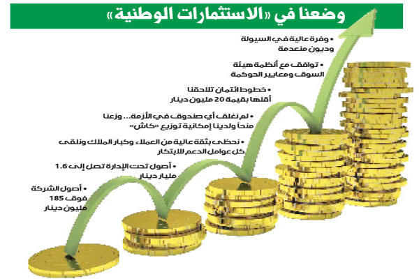وحذّر من خطورة استمرار الوضع الراهن اقتصادياً على المصارف والشركات المتزنة والمليئة مالياً التي تحملت تداعيات السنوات الماضية، مضيفاً أن المبادرات الحكومية من شأنها تعزيز وإعادة الثقة في الاقتصاد المحلي، فيما السوق المالي غائب.وذكر أنه بإجراءات ذكية وحصيفة يمكن تشجيع القطاع الخاص على التوسع في استثمارات يعتمد فيها على أمواله المكدسة في ودائع بسبب غياب الرؤية وعدم وجود منظومة اقتصادية واضحة تمكن المستثمر من العمل على أساسها. وفي ما يلي نص الحوار: • بداية، ما المركز المالي لـ"الاستثمارات الوطنية" حاليا بعد مرور 7 سنوات على الأزمة؟- نحن في وضع مالي مريح، فعشية اندلاع الأزمة المالية اتخذنا قرارا استراتيجيا بخفض الديون إلى أقصى حد ممكن، ومضينا في تطبيق هذه الاستراتيجية حتى وصلنا إلى سداد كل الالتزامات على الشركة، وكانت وقتها نحو 54 مليون دينار، والآن الاستثمارات الوطنية مركزها المالي قوي، فحجم أصولها يفوق 185 مليون دينار، رغم كل الضغوط والتحديات والتراجعات في قيم الأصول.مستويات السيولة• ماذا عن مستويات السيولة لدى الشركة؟- نتمتع ولله الحمد بمعدلات سيولة عالية تمكننا من التحرك واقتناص اي فرصة، لكن اين هي الفرص والخيارات التي أمامنا في السوق المحلي؟ فضلا عن السيولة التي تحت يدنا المتاحة من بنوك محلية تعرض علينا خطوط ائتمان بمبالغ يمكن وصفها في هذه الأزمة بأنها كبيرة جدا، اقلها يصل الى 20 مليون دينار.وقلما نجد شركة استثمار حاليا يمكن ان يعرض عليها بنك هذه المبالغ، خصوصا ان شركات الاستثمار في الأزمة كانت اكثر المتضررين، وغالبيتها غرق في الديون، لكن تميزنا عن الآخرين بأننا من البداية كانت لدينا رؤية واستراتيجية نسير عليها بتوازن وتحفظ ومن دون تهور او مبالغة، وثبتت الأزمة صواب النهج الذي كنا نتبعه ونسير عليه.• هل تأثر بزنيس إدارة الأصول وتراجعت مستويات الأصول ت الإدارة؟- بعد الأزمة الجميع واجه صعوبة كبيرة في إقناع العملاء والمستثمرين بالدخول في صناديق او محافظ، لأن من سيدخل في السوق الكويتي لا يعرف وقتا محددا يمكن خلاله ان يتخارج من هذه الاستثمارات، سواء بعد عامين او عشرة أعوام، فسيولة السوق ضئيلة وضعيفة جدا، وهذا الوضع مستمر منذ الأزمة دون معالجة.أما عن حجم الأصول التي تحت يد "الاستثمارات الوطنية" فتبلغ تقريبا نحو 1.6 مليار دينار، وقد تراجعت كقيمة، لكن عملاء الشركة لديهم الثقة بالإدارة وامكاناتها وقدراتها على تنويع الفرص والتحوط وتحقيق معدلات نمو جيدة.أسواق الخليج• معظم الشركات المحلية في العامين الماضيين اتجهت لأسواق الخليج، هل ذهبتم بنفس الاتجاه؟- نعم توجهنا للاستثمار في الأسواق الخليجية، ونحن مضطرون لذلك، خصوصا اننا محليا في وضع سيئ، ومن أسوأ إلى أسوأ، بسبب غياب أي محفزات، فضلا عن جمود الأوضاع، رغم ان كل اسواق العالم عادت الى مستويات افضل مما كانت عليه بسبب الإجراءات التي اتخذتها حكومات تلك الدول.وهناك أسباب أخرى تبرر توجهنا للأسواق الخليجية، فعلى سبيل المثال تصل قيم التداول اليومي في السوق السعودي الى نحو 14 مليار ريال، ما يعادل مليار دينار، فأنت تعمل في سوق سائل وحقيقي، وعندما تقرر التخارج تجد من يشتري منك، مقارنة بسوق الكويت الذي لا تتعدى معدلات التداول فيه في احسن الأحوال 25 مليون دينار، فبعد ان كنا نضحك على بعض الأسواق الخليجية صرنا الآن اضحوكة وحيدة وفريدة من نوعها.• برأيك، لماذا السوق المالي بعيد عن أي اهتمام مدروس ومعالجة عملية؟- القائمون على الإدارة الاقتصادية يعتبرون البورصة غير مهمة، علما ان هذا الكيان ضلع مهم في المعادلة الاقتصادية، والجميع ينظر إلى اقتصادنا من نافذة السوق، فهو مرآة ومعيار حقيقي وصورة للوضع الاقتصادي، وتردي اوضاع السوق سبب رئيسي في حالة الجمود التي تمر بها العديد من قطاعات الدولة، وقد حمل هذا التردي الدولة مبالغ هائلة نتيجة التوظيف وزيادات الرواتب وغيرها من الامتيازات.• ما الإجراء الأنسب برأيك؟- لن نعيد اختراع