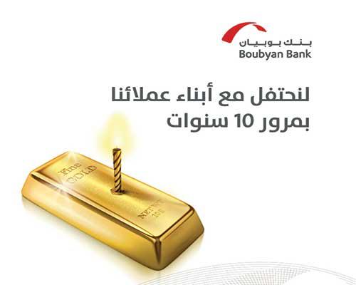 في إطار احتفالاته بمرور 10 سنوات على التأسيس، فاز الكثير من عملاء بنك بوبيان بجوائز قيمة عبارة عن سبائك ذهبية، ضمن الفعاليات والأنشطة التي أعلنها بهذه المناسبة المنظمة على مدار نوفمبر الماضي.وكان البنك فاجأ عملاءه والسوق الكويتي بتقديم هدايا قيمة عبارة عن سبائك ذهبية من وزن 10 غرامات لجميع أبناء عملائه المولودين في نوفمبر 2004، احتفالا منه بمرور 10 سنوات على تأسيسه.