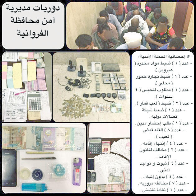 وأضاف المصدر، أنه لدى تفتيش الوافد عثر بحوزته على كميات متنوعة من المواد المخدرة وأدوات التعاطي، وتبين أن الآسيوي من الجنسية البنغالية ومخالف لقانون الإقامة ومطلوب على ذمة قضايا مخدرات وصادر بحقه حكم حبس لمدة 5 سنوات.«الميسر» على الطريق العام وذكر المصدر، أن رجال الدوريات بقيادة النقيب حمد الجندول واصلوا حملاتهم في منطقة جليب الشيوخ، وتمكنوا من ضبط وافدين بنغلاديشيين وبالجرم المشهود أثناء لعبهما وإدارتهما للميسر على الطريق، مشيراً إلى أن رجال الدوريات تمكنوا من ضبطهما بعد مطاردة عنيفة وعثروا بحوزتهما على مبالغ مالية كبيرة وأوراق خاصة بتسجيل لعب الميسر.اتصالات دولية وعمالة سائبةوبين المصدر، أن رجال الدوريات تمكنوا أيضاً من ضبط وافد بنغلاديشي أثناء تجوله في ساعة متأخرة من الليل، وعند الطلب منه التوقف لاذ بالقرار وطارده رجال الأمن حتى تمكنوا من ضبطه في أحد المنازل التي تبين أن بنغالياً آخر يديره لسرقة المكالمات الدولية.ولفت إلى أن رجال الدوريات عثروا داخل المنزل على أجهزة خاصة في سرقة المكالمات الدولية، كما تبين لهم أن البنغالي يعمل على توزيع أوراق اليانصيب والبنغالي الآخر الذي يدير وكر سرقة الاتصالات الدولية هما مخالفان لقانون الإقامة منذ عدة سنوات وصادر بحقهما أمر ضبط وإحضار.
