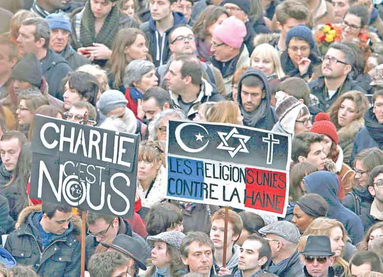 • عبوة تحرق صحيفة ألمانية نشرت صور «شارلي»... وإخلاء صحيفة بلجيكية تعرضت لتهديد• كيري: أي عمل إرهابي لن يوقف أبداً مسيرة الحرية • تأييد الهولنديين لخيرت فليدرز يتضاعففي تضامن غير مسبوق مع فرنسا، بعد أسوأ واقعة إرهابية في تاريخها الحديث، انضم العشرات من رؤساء الدول والحكومات بينهم مسلمون، إضافة إلى أحزاب ونقابات ومجموعات دينية يهودية ومسيحية ومسلمة وجمعيات وشخصيات عامة، إلى أكثر من مليون ونصف مليون فرنسي، في «مسيرة الجمهورية» التي جرت وسط إجراءات أمنية مشددة، وتحولت معها باريس إلى عاصمة لمكافحة الإرهاب، الذي خلف على مدار ثلاثة أيام نحو 17 قتيلاً في هجوم على أسبوعية "شارلي إيبدو"، تلاه استهداف شرطة البلدية، ثم عمليتا احتجاز رهائن متزامنتان، إضافة إلى ما أثاره ذلك من تساؤلات حول حرية التعبير والدين والأمن، خصوصاً للجاليات العربية والمسلمة.تحوّل أسوأ هجوم تشهده فرنسا منذ 5 عقود إلى مأساة ذات بعد عالمي مع مشاركة أكثر من خمسين زعيماً في دول أجنبية في مسيرة تاريخية في باريس تقدمها الرئيس الفرنسي فرانسوا هولاند، تكريماً لضحاياً سقطوا على مدار ثلاثة أيام على يد ثلاثة متطرفين اثنين منهم على علاقة بتنظيم "القاعدة" في جزيرة العرب، والآخر بايع فعلياً تنظيم "الدولة الإسلامية" المعروف بـ"داعش".وفي أقوى تحد للجماعات الإرهابية، سبقت حشود بشرية هائلة زعماء العالم إلى قلب باريس، حيث انطلقت المسيرات المليونية من ساحة لاريبوبليك (الجمهورية) إلى ساحة لاناسيون (الأمة) اللتين يفصل بينها ثلاثة كيلومترات، في تكريم لم يسبق له مثيل لضحايا هجمات نفذها متطرفون.وعلى مدار ثلاثة أيام عاش فيها الفرنسيون كابوساً دموياً، مع إقدام الفرنسيين من أصل جزائري شريف وسعيد كواشي على قتل 10 صحافيين في "شارلي إيبدو" وشرطيين، قبل أن يتحصنا بمطبعة مع رهينة في شمال باريس بالتزامن مع عملية مماثلة قام بها الفرنسي من أصل مالي حمدي كوليبالي قتل فيها شرطية في البلدية قبل أن يتحصن في متجر يهودي ومعه عدد كبير من الرهائن، وانتهت بمقتل منفذي الاعتداءين و4 رهائن.الصف الأولوظهر في الصف الأول للمسيرة، التي تواجدت فيها الجاليات العربية والمسلمة بقوة رغم المخاوف من رد فعل عنيف تجاهها، إلى جانب الرئيس الفرنسى المستشارة الألمانية أنجيلا ميركل، ورئيس الوزراء البريطانى ديفيد كاميرون، والملك عبدالله الثاني عاهل الأردن، وقرينته الملكة نور، ورئيس الوزراء التركي أحمد داوود أوغلو، ونظيره البريطاني ديفيد كاميرون وغيرهم.كما شارك في هذا التجمع غير المسبوق قادة أطراف متصارعة، بينهم الرئيس الفلسطيني محمود عباس، ورئيس الوزراء الإسرائيلي بنيامين نتنياهو، وأيضاً الرئيس الأوكراني بيترو بوروشينكو، ووزير الخارجية الروسي سيرغي لافروف.وتم نشر نحو 2200 من أفراد الأمن لحماية المسيرة من أي مهاجمين محتملين وتمركز قناصة على أسطح المباني، في حين اختلط رجال شرطة بالزي المدني بالحشود.وتم تفتيش نظام الصرف الصحي في باريس قبل المسيرة، وإغلاق محطات قطارات الأنفاق حول مسارها، بينما نقلت وسائل المواصلات العامة القادمين إلى باريس بالمجان.المطلوبة الأولىمن جهة ثانية، قالت مصادر تركية وفرنسية، إن المطلوبة الأولى حياة بومدين (26 عاماً) شريكة كولوليبالي، التي تلاحقها الشرطة الفرنسية، غادرت فرنسا قبل عدة أيام من الهجمات ويعتقد أنها في سورية.وذكر مسؤول أمني تركي كبير أن باريس وأنقرة تتعاونان الآن في محاولة لتعقبها، لكنه أضاف أنها وصلت إلى اسطنبول دون أي تحذير من استخبارات فرنسا. وقال المصدر التركي "نعتقد أنها في سورية في هذه اللحظة، لكن ليس لدينا دليل على ذلك. على الأرجح هي ليست في تركيا".اتفاقية الشينغنوقبل ساعات من التظاهرة، التي تحولت معها باريس إلى عاصمة العالم، التقى وزراء الداخلية والأمن الأوروبيون والأميركيون في وزارة الداخلية الفرنسية أمس، لبحث رد مشترك على تهديد الهجمات الإرهابية.وبينما كان وزير العدل الأميركي إريك هولدر أو