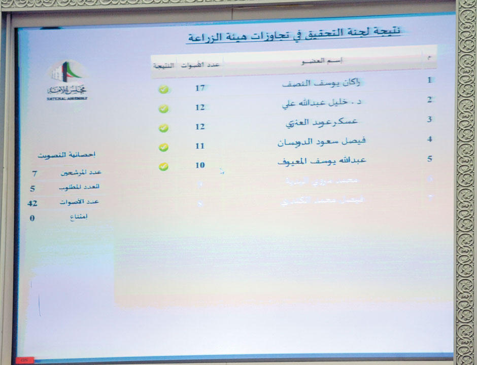 وافق مجلس الامة في جلسته أمس على تشكيل لجنة تحقيق برلمانية بشأن تجاوزات شابت عملية توزيع حيازات زراعية بمنطقة الوفرة والتجاوزات الاخرى ذات الشأن وذلك لمدة ثلاثة أشهر.وانتخب المجلس في عضوية اللجنة كلا من النواب راكان النصف وخليل عبدالله وعسكر العنزي وفيصل الدويسان وعبدالله المعيوف، بعد ان ترشح لها 9 اعضاء.