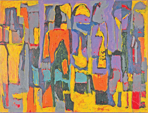 ويستند عرابي في ابتكاراته إلى التجريد الغنائي محافظاً على نبض اللوحة وتناغمها ضمن تراكيب متداخلة بشكل انسجامي.