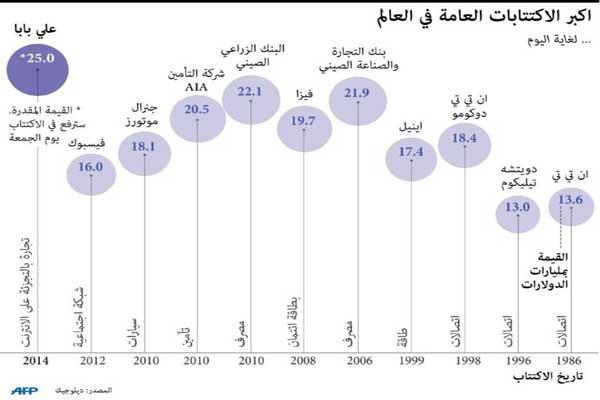 حددت مجموعة علي بابا القابضة الصينية سعر سهمها عند 68 دولاراً - وهو الحد الأعلى لنطاق التسعير المتوقع - في طرحها العام الأولي الذي جمعت من خلاله 21.8 مليار دولار أمس الأول.وسيرفع الطرح الأولي - وهو أحد أكبر الطروحات العامة الأولية على الإطلاق - القيمة السوقية للشركة إلى 167.6 مليار دولار، لتتفوق بذلك على شركات أميركية كبرى مثل "وولت ديزني" و"بوينغ"، كما سيرفعها فوق شركات أميركية للتجارة الإلكترونية مثل "أمازون" و"إيباي"، ويمنحها مزيداً من القوة المالية للتوسع في الولايات المتحدة وأسواق أخرى.