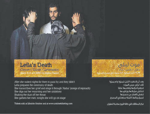 ينطلق اليوم العرض المسرحي {موت ليلى} ويستمر حتى 29 مارس الجاري على خشبة مسرح المدينة بالحمرا في بيروت.