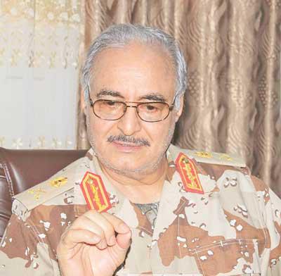 • هناك مخاوف من استهداف مئات الآلاف من المصريين في ليبيا، عقب قيام تنظيم «داعش» بذبح 21 قبطيا؟- أعدكم بأن يخرج المصريون سالمين من ليبيا، ولن نسمح لأحد بالمساس بهم، مهما كانت الصعوبات، واتفقنا مع مصر على تأمين خروج الأشقاء المصريين، وهناك وفد ليبي زار القاهرة خلال الساعات الماضية، واتفق على تفاصيل جديدة، وهناك عناصر من الجيش سيتم تدريبها داخل مصر، ونتواصل مع جميع المسؤولين في مصر، وقد وعدونا بتوفير كل أوجه الدعم لإعادة بناء الجيش الليبي مرة أخرى.• كيف جاء التنسيق مع الجانب المصري عسكريا ضد التنظيمات الإرهابية؟ - في البداية تمنينا أن يكون التنسيق مع الجانب المصري منذ فترة كبيرة، حتى نتمكن من القضاء على الجماعات الإرهابية المنتشرة في ليبيا، وكان اعتقادنا دائما أن هناك دولا تدعم الإرهاب داخل دولتنا، وحسابهم معنا قريب جدا، هؤلاء الذين جاءوا إلى ليبيا من سورية والعراق، ومن كل بقاع العالم، ونحن لن نسمح لهم بهدم الدولة الليبية، وتحويلها إلى إمارة للجماعات الإرهابية، وسنتصدى بكل قوة لهذه المحاولات.• هناك حديث عن الانقسام الليبي حول الضربة المصرية؟- مصر صمام الأمان، ووجودها في الضربات العسكرية زاد قوة هذه الضربات على معسكرات تدريب العناصر الإرهابية، التي تم استهدافها بقوة، ونتعاون مع مصر كشقيقة كبرى تقف بجانبنا ولن تسمح بسقوطنا، والضربات الجوية مستمرة خلال الأيام المقبلة، ونحدد كل أماكن تواجد العناصر الإرهابية لاستهدافها.• ألا تخشى على حياتك من مثل هذه الجماعات الإرهابية؟- أنا قائد عسكري لا أخاف إلا الله، ولا أخشى على حياتي، فأنا موجود في ليبيا، ولو حدث لي شيء فهناك من سيكمل المسيرة من بعدي، وهناك رجال أوفياء لن يسمحوا بسقوط ليبيا، وظني في الوقت نفسه أن الدول العربية لن تسمح بسقوط ليبيا.• هل ستترشح لرئاسة ليبيا بعد هدوء الأوضاع على الأرض؟- الوقت غير مناسب للحديث عن ذلك، وأعتقد أنه سابق لأوانه، لأن الأهم الآن هو عودة ليبيا إلى سابق عهدها، وأناشد المجتمع الدولي ضرورة رفع الحظر عن تسليح الجيش الليبي في هذا الوقت الحساس، الذي تمر به البلاد.