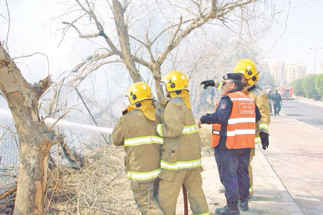 عاش رجال الإطفاء، أمس، يوما عصيبا، وسط ظروف مناخية في غاية الصعوبة تمثلت في ارتفاع درجات الحرارة مع موجة الغبار التي تشهدها البلاد، وذلك عندما تعاملوا صباح أمس مع حريقين كبيرين أسفرا عن إصابة 6 اطفائيين بحالات اختناق ومجهود حراري، حيث اندلع الحريق الأول في مزرعة مكشوفة بمنطقة صباح السالم، في حين كان الثاني في موقع لبيع الأعلاف على طريق السالمي.حريق «صباح السالم» وعن تفاصيل الحادث الأول، قال رئيس قسم الإعلام في الإدارة العامة للإطفاء، الملازم أول رضا السلمان، إن غرفة عمليات الإدارة العامة للإطفاء تلقت بلاغا صباح أمس يفيد باندلاع حريق في مزرعة مكشوفة بمنطقة صباح السالم، وفور تلقي البلاغ تم تحريك مراكز إطفاء مشرف والقرين والفحيحيل والإسناد بقيادة مدير إطفاء محافظة حولي العميد محمد المحميد.وأضاف السلمان أن أن الحريق نشب في مزرعة تبلغ مساحتها 100 ألف متر مربع، وأن ألسنة اللهب امتدت على مساحة 5 آلاف متر مربع من المزرعة، وقد شرع رجال الإطفاء في إخماد الحريق الذي أتى على أشجار وأحراش في المزرعة، وحالوا دون امتداده الى بقية المساحة، لافتا إلى أن نائب المدير العام لشؤون المكافحة، العميد جمال البليهيص، أشرف على مكافحة الحريق الذي تمت السيطرة عليه بعد حوالي 3 ساعات من اندلاعه، مبينا أنه أسفر عن وقوع 6 إصابات بين رجال الإطفاء، وتم علاجهم في موقع الحادث من قبل فنيي الطوارئ الطبية.أعلاف السالميوعن تفاصيل الحادث الآخر، قال السلمان إن غرفة عمليات الإدارة العامة للإطفاء تلقت بلاغا ظهر أمس يفيد باندلاع حريق في سوق الأعلاف بمنطقة بر السالمي، وتحديدا عند الكيلو 27، وفور تلقي البلاغ تم تحريك مراكز إطفاء السالمي والجهراء الحرفي وكبد والمدينة والإسناد وخور الصبية وأم الهيمان الى موقع البلاغ، بقيادة المدير العام للإدارة العامة للإطفاء بالانابة، اللواء خالد المكراد، ونائب المدير العام لشؤون المكافحة العميد جمال البليهيص، ومدير إطفاء محافظة الجهراء بالوكالة المقدم خالد المهيني.وأضاف أن رجال الإطفاء عانوا صعوبة بالغة في مكافحة الحريق، نظرا لتخزين الأعلاف في أماكن مكشوفة، وكذلك الظروف المناخية الصعبة المتمثلة في سرعة الرياح وحرارة الطقس، الأمر الذي ساعد في امتداد رقعة النيران، ليدخل بعدها رجال الإطفاء في سباق مع ألسنة اللهب التي كانت تنتقل بسرعة كبيرة من موقع لآخر، مشيرا إلى أن قيادات الإطفاء طلبت إسنادا من بلدية الكويت لإرسال جرافات لعزل المواقع المشتعلة وضمان عدم امتداد النيران الى مواقع أخرى، وقد ساهمت وصلت جرافات البلدية والإطفاء لدى وصولها الموقع بشكل كبير في المكافحة والسيطرة على الحريق.