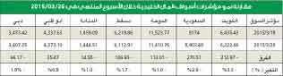عمّ اللون الأحمر معظم جلسات مؤشرات أسواق دول مجلس التعاون خلال تعاملاتها الأسبوع الماضي، بالتالي كانت محصلتها الأسبوعية حمراء في معظمها. وتصدر السوق الكويتي المشهد هذه المرة خاسراً 3.3 في المئة تلاه مؤشر «تاسي» السعودي الذي خسر ما يقارب 3 في المئة، وتراجع مؤشر دبي بحوالي 2 في المئة كذلك، تلاه مؤشر مسقط بنسبة 1.7 في المئة وتعادل سوقا الدوحة والمنامة، وحذف كل منهما نسبة 1 في المئة، وكان الاستثناء الوحيد الأخضر مؤشر سوق أبوظبي، الذي ارتفع بنسبة 0.8 في المئة.الكويتي وخسارة مضاعفةتراجعت مؤشرات سوق الكويت بشدة وازدادت سلبيتها، وتعرضت لثلاثة عوامل مؤثرة جميعها استقبلها السوق بسلبية كبيرة، كان أولها تراجع الأسواق بداية الجلسة ثم انتظار جلسة مجلس الأمة منتصف الأسبوع التي علقت عليها الآمال بتعديل بعض مواد لائحة أسواق المال، تلاها في نهايته بداية حرب تعتبر الكويت طرفاً فيها، وهي «عاصفة الحزم» حيث الطلعات الجوية على جماعة الحوثيين في اليمن غير معروفة نهايتها ومداها، تحت ضغط هذه العوامل والتي زادت من سلبية سوق ضعيف ذي سيولة محدودة تراجعت المؤشرات سعري ومؤشرات وزنية، وكان هناك عامل فني سبب تراجعاً إضافياً، هو تفسيخ سهمي «الوطني» و«بيتك» من أسهم المنحة دون تعديل المؤشر وسعرها وبالتالي كانت خسارتهما أكثر من الواقع ليخسر مؤشر «كويت 15» والذي يقيس أداء أكبر 15 شركة من حيث الوزن والأسهم الحرة والسيولة نسبة 4.2 في المئة، والتي تعادل 44.16 نقطة ليقفل على مستوى 1018.34 نقطة، وهي من أكبر خسائره خلال الأشهر الستة الأخيرة.وتراجع مؤشر السوق بنسبة 3.6 في المئة تعادل حوالي 16 نقطة ليقفل هو الآخر على مستوى 423.64 نقطة، بينما خسر المؤشر الرئيسي «السعري» نسبة أقل كانت 3.3 في المئة، لكنها الأكثر خليجياً كانت 213 نقطة تقريباً ليتراجع إلى مستوى 6222.46 نقطة.وتراجعت حركة تعاملات السوق الكويتي بنسب محدودة، وكان هناك تفاوت كبير بين جلسة وأخرى حيث سجل الأسبوع أدنى سيولة خلال جلسة واحدة كانت 8 ملايين دينار، ثم وبسبب عمليات البيع والقلق ارتفعت السيولة بنهايته إلى 25 مليون دينار، واستمر النشاط بمعدلاته السابقة وخسر فقط 4.4 في المئة وتراجع عدد الصفقات بنسبة أقل كانت 3 في المئة.السعودي وخسارة كبيرةتأثر السوق السعودي بداية الأسبوع ونهايته كحال السوق الكويتي، ولكن بنسب أقل حيث أنه السوق الأكثر اهتماماً حكومي خصوصاً خلال الازمات، وبما أن المملكة تقود «عاصفة الحزم»، إذن الاهتمام أكبر، وبعد أن كانت خسائر كبيرة بنهاية الأسبوع استطاع أن يقلصها وينتهي أسبوعه على خسارة نسبة 2.9 في المئة تعادل 270.5 نقطة ليقفل على مستوى 8903.49 نقاط، وساد التذبذب جلسات الأسبوع، وكان الميل للبيع أكثر حيث توتر الأوضاع الإقليمية، وحتى ارتفاعات سعر النفط لم تكن ذات فائدة خلال جلسة الأسبوع الأخيرة، والتي كان سيد حديثها «عاصفة الحزم» وتداعيات الوضع الإقليمي. دبي ومسقطوسجلت بقية أسواق المنطقة خسائر أقل مما هي عليه في الكويت والسعودية، حيث تراجع دبي بنسبة اقتربت من 2 في المئة تعادل 66.17 نقطة بسيولة متراجعة كحال السوق الكويتي، وكان للنصف الأخير من جلسته الأسبوعية الفضل في إنقاذه من خسارة كبيرة قد تصل إلى 6 في المئة، لكن مع بدء عمل السوق السعودي التقط السوق أنفاسه وبدأ عملية استعادة النقاط لينهي أسبوعه على خسارة محدودة نسبياً ويقفل على مستوى 3407.25 نقاط.وكان العكس في سوق مسقط، حيث أن خسارته كانت في مجملها خلال جلسة واحدة وهي آخر جلساته التي تكبد خلالها ما يقارب 2.6 في المئة، إذ أن الحرب على بعد كيلومترات قليلة من السلطنة، وهي أقرب المناطق لها، رغم أن عُمان لم تشارك في التحالف لضرب الحوثيين، والتهمت خسائر جلسة الخميس الماضي مكاسب أربع جلسات لينتهى على مستوى 6112.91 نقطة مؤشرها حاذفاً 106.95 نقاط.الدوحة والمنامة خسارةنقطة مئويةسجل مؤشرا الدوحة والمنامة خسارة متماثلة بنسبة 1 في المئة فقط، حيث استقر مؤشر سوق الدوحة على مستوى 11410.76 نقاط خاسراً 113.01 نقطة، وكان شأنه قر