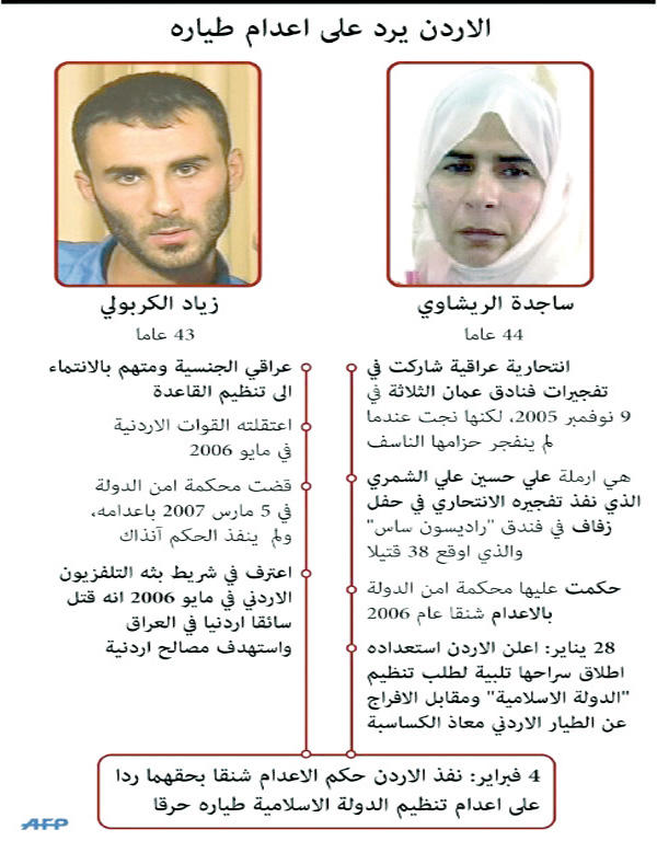 رداً على قتل «داعش» للطيار الأردني معاذ الكساسبة حرقاً، أعدم الأردن ساجدة الريشاوي وزياد الكربولي، وقرّر تصعيد مشاركته في الائتلاف الدولي ضد «داعش»، وسط حالة من الغضب والسخط أصابت الأردنيين.