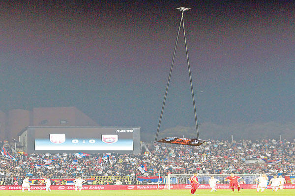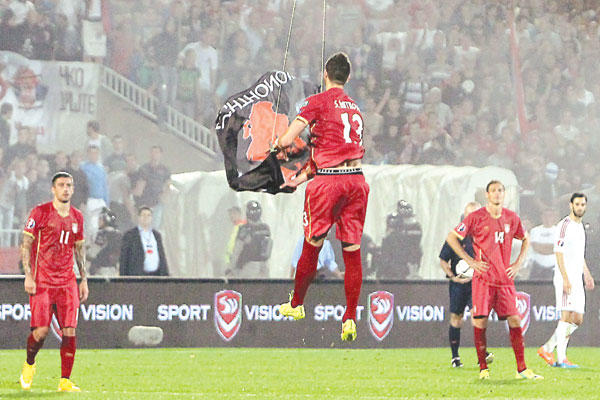 أوقف الحكم مباراة صربيا وألبانيا ضمن الجولة الثالثة من منافسات المجموعة التاسعة في تصفيات كأس اوروبا لكرة القدم المقررة نهائياتها في فرنسا عام 2016، قبل نهاية شوطها الأول بسبب احداث شغب بين لاعبي المنتخبين ودخول جماهير اصحاب الارض الى الملعب.واندلعت الأحداث في الدقيقة 41 والنتيجة تشير الى التعادل السلبي عندما جابت طائرة بدون طيار تحمل العلم الألباني، أرجاء ملعب المباراة التي تابعها أكثر من 20 ألف متفرج بينهم الريس الصربي طوميسلاف نيكوليتش.