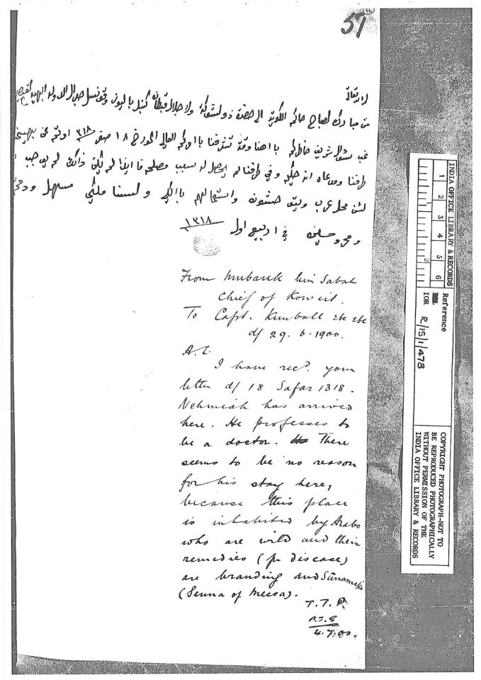 "من طرف حاج حسن الحكيم في 25 ذي القعدة وصل بندر الكويت معه ابنه ميرزا علي وزوجة ابنه ميرزا علي وخادمهم كريم، حين الوصول اجرو لهم بيت".وفي رسالة لاحقة عنوانها "علوم دخول البلد الكويت 1317"، يقول علي بن غلوم: "ايضا نعرفكم من طرف حاج حسن الحكيم من جاه الى الكويت ما عالجله مريض الذي شافاه وقليل المترددين عنده قاصد بان يروح الى البصرة يقول عن لسانه لنا بان اهل البصرة كاتبين لي بان لازم لازم تقدم علينا...". ويبدو أن طبيبا آخر كان على وشك الوصول الى الكويت اسمه "نهيميا"، اشار له الشيخ مبارك في رسالة في أول ربيع أول 1318 (الموافق 29/6/1900)، لكن الشيخ مبارك رفض قدومه للكويت، وبرر رفضه بأن سكان البلد لا يتداوون بالعلاج الحديث. يقول في الرسالة:"امرتم عن بهيميا يجي طرفنا ومدعاه انه حكيم وفي طرفنا يحصل له سبب مصلحة فاايذا لم يكن ذالك لم يوجب مجيه لئن محل عرب ويتوحشون واستعمالهم بالكي والسنا ملكي سهل ودمتم سالمين ومحروسين".وهنا، وقبل أن نخوض في تفاصيل أخرى، أود الإشارة الى الكتاب القيم "تاريخ الخدمات الصحية في الكويت"، الذي ألّفه الدكتور خالد فهد الجارالله (إصدار مركز البحوث والدراسات الكويتية 1996)، والذي يتضمن تاريخا شاملا في مجال التطبيب والصحة، ويعرض بالوثائق والمستندات الكثير من المعلومات عن هذا الموضوع.في المقال المقبل سأتحدث عن تغير في موقف الشيخ مبارك تجاه الحاجة إلى طبيب، إذ إنه أرسل رسالة إلى الإنكليز يطلب فيها منهم جلب "حكيم" للكويت، وسأتحدث عن رد الإنكليز على طلب الشيخ مبارك وبعض التفاصيل اللاحقة بمشيئة الله تعالى.