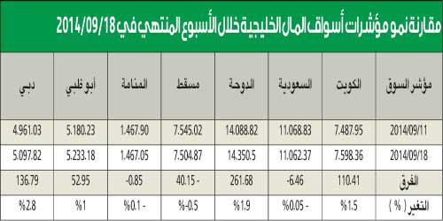 استطاع مؤشر سوق دبي تخطي مستوى 5 آلاف نقطة، في حصيلة تداولات الأسبوع الماضي، مرتفعاً 2.8%، تلاه مؤشر سوق قطر بـ1.9%. ووسع مؤشر الكويت أرباحه الأسبوعية لتصبح 1.5%، في حين ربح أبوظبي 1%، بينما تراجعت مؤشرات مسقط والسعودية والمنامة.