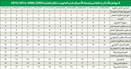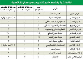 ذكر رئيس لجنة الكويت الوطنية للتنافسية أنه على الرغم من نقاط القوة التي تمتلكها الكويت، فإن هناك مكامن ضعف كثيرة منها انخفاض جودة التعليم وعدم توافقها مع متطلبات سوق العمل وتعقيد الإجراءات الحكومية والمركزية المرتفعة في اتخاذ القرار.