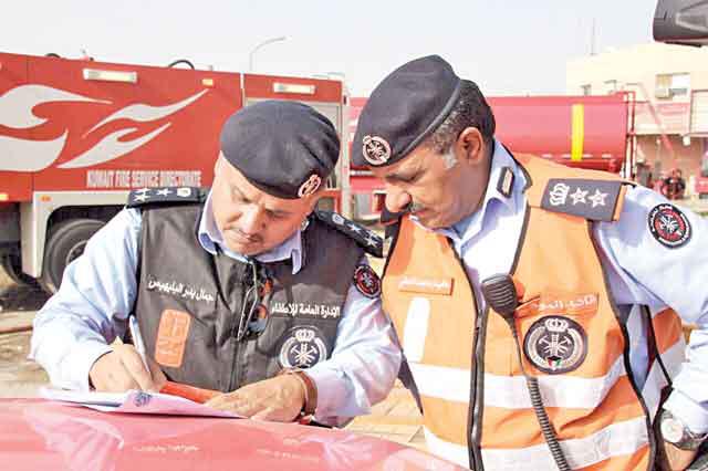 أصيب رجلا إطفاء ووافد عربي بحالات اختناق وإجهاد حراري من جراء حادث حريق اندلع ظهر أمس في قسيمتين صناعيتين بمنطقة الري، كما أسفر الحادث عن خسائر مادية جسيمة لحقت بالقسيمتين اللتين تحتويان على أصباغ وحديد ومواد أخرى سريعة الاشتعال. وفي التفاصيل، التي رواها مدير إدارة العلاقات العامة والاعلام في الادارة العامة للاطفاء العقيد خليل الامير، أن غرفة عمليات الادارة تلقت بلاغا ظهر أمس يفيد باندلاع حريق في قسيمة صناعية بمنطقة الري.وأشار خليل الامير الى انه فور تلقي البلاغ تم تحريك مراكز اطفاء الشويخ الصناعي والعارضية الصناعي والشهداء والعمليات الى موقع البلاغ، بقيادة نائب المدير العام لشؤون المكافحة العقيد جمال البليهيس، ومدير إطفاء محافظة العاصمة بالوكالة العقيد محمد الشطي.واضاف ان رجال الاطفاء فور وصولهم تبين لهم ان الحريق امتد الى قسيمة مجاورة للقسيمة التي اندلع بها، لافتا الى ان رجال الاطفاء وعلى الفور وضعوا خطة للمكافحة، ومنع امتداد رقعة الحريق، خصوصا ان القسيمتين تحتويان على اصباغ وحديد ومواد اخرى سريعة الاشتعال.وتابع ان رجال الاطفاء نجحوا في السيطرة على الحريق في زمن قياسي، وحالوا دون امتداد النيران الى مواقع اخرى، مضيفا ان رجال الاطفاء استدعوا ضباط وحدة تحقيق الحوادث لبيان اسباب اندلاع النيران في الموقع.والمح الى ان الحادث اسفر عن إصابة رجلي اطفاء ووافد عربي بحالات اختناق ومجهود حراري، وتم علاجهم في موقع الحادث من قبل فنيي الطوارئ الطبية الذين تواجدوا في موقع الحادث، اضافة الى تواجد رجال الامن.