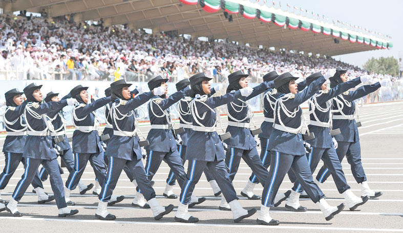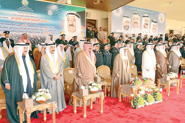 برعاية وحضور سمو أمير البلاد الشيخ صباح الأحمد، القائد الأعلى للقوات المسلحة، أقيم صباح أمس حفل تخريج الدفعة 41 من الطلبة الضباط، والدفعة 26 من الطلبة ضباط الاختصاص، والدفعة 7 من طالبات الاختصاص بمعهد الهيئة المساندة، في ميدان أكاديمية سعد العبدالله للعلوم الامنية.ووصل موكب سموه الى مكان الحفل، حيث استقبل بكل حفاوة وترحيب من قبل نائب رئيس مجلس الوزراء وزير الداخلية الشيخ محمد الخالد، ووكيل وزارة الداخلية الفريق سليمان الفهد، ووكيل الوزارة المساعد لقطاع شؤون التعليم والتدريب اللواء الشيخ فيصل النواف، والوكلاء المساعدين بالوزارة، ومدير عام اكاديمية سعد العبدالله للعلوم الامنية بالتكليف العميد ناصر بورسلي، وكبار ضباط الداخلية.وشهد حفل التخرج سمو ولي العهد الشيخ نواف الاحمد، ورئيس مجلس الأمة مرزوق الغانم، ورئيس مجلس الأمة السابق جاسم الخرافي، وكبار الشيوخ، وسمو الشيخ ناصر المحمد، وسمو الشيخ جابر المبارك رئيس مجلس الوزراء، والنائب الاول لرئيس مجلس الوزراء وزير الخارجية الشيخ صباح الخالد، ونائب وزير شؤون الديوان الاميري الشيخ علي الجراح، وكبار المسؤولين في الدولة، وجمع غفير من اهالي الطلبة الخريجين والمواطنين.وبدأ الحفل بالسلام الوطني، ثم قام أحد الطلبة الضباط بتلاوة ما تيسر من آيات الذكر الحكيم، بعدها ألقى وكيل وزارة الداخلية المساعد لشؤون التعليم والتدريب اللواء النواف كلمة قال فيها: "بكل آيات الفخر والاعتزاز وكلمات العرفان والامتنان التي تنسج معاني الشكر لكم يشرفنا ان نرحب بسمو امير البلاد القائد الاعلى للقوات المسلحة الشيخ صباح الاحمد وولي العهد الشيخ نواف الاحمد لتشهد الكويت واهلها رعايتكم السامية لحفل تخريج ابنائكم الخريجين والخريجات".طرق تدريب حديثةوأضاف النواف: "لقد تم إعداد الخريجين وتأهيلهم وصقل مواهبهم على أحدث الطرق واساليب التعليم والتدريب المتطور والحفاظ على المصالح العليا لامن الوطن ووحدة اراضية ليظل واحة للبناء والعطاء تحت قيادتكم الرشيدة. إنهم من الجيل الواعد مسلحين بقيم التضحية والفداء بعد الولاء للوطن الغالي ولسموكم".وتابع: "ان ابناءك يا سمو الأمير ملتزمون بعلو الهمة، ولا يقبلون بأقل من القمة يلبون النداء بالفداء وأرواحنا للوطن تنطق بالولاء، دماؤنا تروي ربوع اراضينا، ورنة السلاح تعزف لحن عزتنا، رايتنا هي غايتنا، وانتم يا سمو الأمير قائدنا اننا ابناؤك المخلصين، على العهد باقون، وعلى الوعد مقسمون الله، الوطن، الامير، إنه لقسم عظيم فى كلمته جليل فى دلالاته فيه عهد بالولاء للوطن الغالي ولسمو امير البلاد قائد نهضتنا ومسيرتنا".وزاد: "هكذا هي الكويت وستظل كذلك بفضل ابنائها المخلصين المسلحين بالايمان والعلم والتضحية وقيم الانسانية"، مضيفا ان الجيل الذي عاهد على الولاء، واقسم على التضحية والفداء، ويلتف حول قيادته في ملحمة وطنية تنموية طموحة قادرة على تحمل المسؤولية وتأمين السفينة والعبور بها الى مرفأ الامان مهما علا الموج واشتدت العواصف.واردف: "اننا اليوم سمو الأمير نقف بين أيديكم لنؤكد لكم اننا نلتزم بالقسم، ونوفي بالعهد، نتضرع الى الله العلي القدير ان يحفظ اميرنا الشيخ صباح الاحمد، وان يحفظ لنا سمو ولي العهد الامين الشيخ نواف الاحمد سندا لكم، وان يديم على بلادنا نعمة الامن والامان والرخاء والاستقرار".مراسم التسليم عقب ذلك، بدأت مراسم تسليم علم الاكاديمية من طلبة الدفعة 41 الى الدفعة 42، وتلاها القرار الوزاري والنتائج النهائية للخريجين والخريجات بقوة الشرطة، التي ألقاها مدير عام اكاديمية سعد العبدالله للعلوم الامنية بالتكليف.وقام قائد طابور العرض بالاستئذان من سمو الأمير ببدء مراسم العرض، كما تم تقديم عرض خاص ومتنوع لقوات الامن الخاصة، اعقبه دخول الخريجين والخريجات ساحة العرض لأداء القسم، الذي القاه مدير كلية الشرطة بالانابة العقيد علي الوهيب.ثم تفضل الأمير بتوزيع الجوائز والشهادات على المتفوقين من الخريجين وال