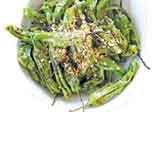 يمكن إيجاد فلفل شيشيتو في بعض أسواق المزارعين وأسواق المنتجات الآسيوية. يمكن استبداله بالفلفل الحلو الصغير. لكن ستصبح مدة الطبخ أطول بقليل في هذه الحالة. كخيار بديل، يمكن قلي وتتبيل شرائح سميكة من فلفل بوبلانو أو الفلفل الأحمر. أحضر وصفة مزدوجة لاستعمال البقايا المفرومة وإضافتها إلى السلطات وسكبها فوق الحساء والبيض المخفوق.المقادير- 4 أكواب من الفلفل شيشيتو الكامل (من دون نزع الجذوع).- ملعقة كبيرة من زيت دوار الشمس أو زيت القرطم أو زيت الكانولا الطارد للضغط. - ملعقتان كبيرتان من الثوم المعمر المفروم والطازج أو الكزبرة أو خليط منهما.- نصف ملعقة صغيرة من بذور السمسم.- ملح خشن.الطريقة1. شغلي مروحة العادم. سخني مقلاة كبيرة على حرارة مرتفعة إلى أن تسخن جيداً.2. أضيفي الزيت ووزعيه في المقلاة كي يسخن كما يجب. أضيفي حبات الفلفل كاملة على شكل طبقة واحدة. اطبخيها ثم قلّبيها إلى أن تتفحم وتصبح طرية، بين 3 و4 دقائق.3. رشي عليها الأعشاب وبذور السمسم والملح. حركي الخليط جيداً. ثم انقليه إلى طبق وقدميه فوراً.