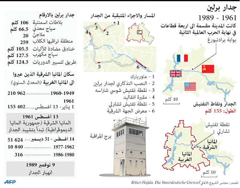 وكان "جدار العار" كما يرى في الغرب و"جدار الحماية من الفاشية" كما يراه الشرق، يمتد على طول 150 كيلومترا وشيدته في 1961 جمهورية ألمانيا الديمقراطية. لكنه انهار بعد 28 عاماً في التاسع من يناير 1989 تحت ضغط البيريسترويكا التي قادها الزعيم السوفياتي ميخائيل غورباتشيوف ومئات الآلاف من المتظاهرين. وبعد أقل من عام على ذلك أعيد توحيد ألمانيا رسمياً في الثالث من أكتوبر 1990. وكتبت المستشارة الألمانية أنجيلا ميركل التي عاشت في المانيا الديمقراطية وكانت تقيم في برلين الشرقية في 1989 أنه انتابها "شعور لا يمكن وصفه" مساء ذلك اليوم، موضحة أنها ستدشن صباح غد الأحد المعرض الجديد الدائم لنصب الجدار وتحضر حفلة موسيقية في قاعة برلينر انسانبل التي كانت مسرح برتولد بريشت.وستكون بوابة براندنبورغ وسط العاصمة في قلب هذه الاحتفالات التي أطلق عليها اسم "شجاعة الحرية". وهذه البوابة التي يعلوها تمثال الخيول الأربعة الشهير، تشكل رمز التقسيم ثم رمز اتحاد المدينة وألمانيا. وكانت تقع شرقاً بموازاة الجدار في منطقة عازلة.وستبدأ الاحتفالات الكبيرة بحفل موسيقي لاوركسترا شتاتسكابيلي بقيادة المايسترو الإسرائيلي الارجنتيني دانيال بارنبويم صباح اليوم. ثم يتناوب مغنو البوب والروك والراب بعد الظهر لتقديم عروضهم حتى الساعة السادسة مساء عندما يقام حفل تكريم "ضحايا الجدار" الذين قتلوا بينما كانوا يحاولون عبوره.(برلين - أ ف ب)