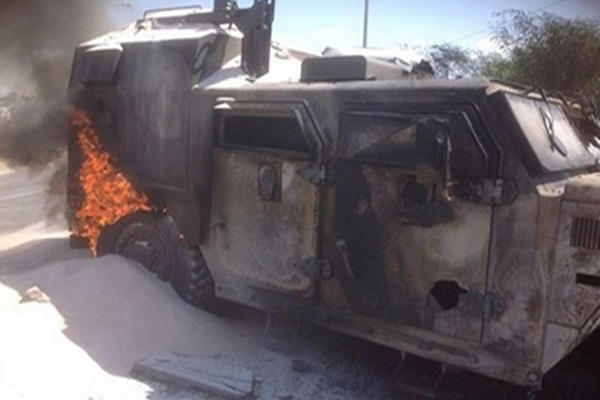 في هجوم يعد الثاني خلال ثلاثة أيام بشمال سيناء، ويظهر توجه جماعة «أنصار بيت المقدس» إلى تصعيد عملياتها الإرهابية، لقي 7 من أفراد الجيش المصري، ضابطان و5 جنود، مصرعهم أمس، إثر انفجار عبوة ناسفة أثناء عبور رتل من المدرعات التابعة للجيش جنوب مدينة العريش.وقال مصدر أمني مصري إن «العبوة انفجرت في مدرعة للقوات المسلحة كانت تمشط خط الغاز الطبيعي بقرية البيل جنوب مدينة العريش، ما أدى إلى تفحمها تماماً»، مضيفاً: «تم إغلاق المنطقة وتمشيطها بحثاً عن الجناة».