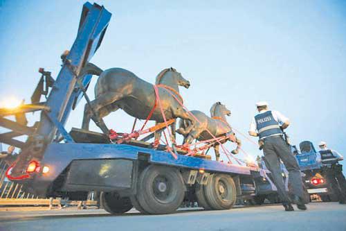 بمساعدة موس، نفذت السلطات أخيراً عملية متقنة. في ما يلي تفاصيل العملية كما عرضتها «شبيغل».في منزل جامع التحف بالقرب من كييل في شمال ألمانيا، وجد ضباط الشرطة منحوتة برونزية ضخمة لمحارب عارٍ يحمل سيفاً بيده الممدودة. يظن الخبراء أنها قد تكون منحوتة {الجيش الألماني}، وهي واحدة من منحوتتين صنعهما آرنو بريكر (نحات رفيع المستوى بالنسبة إلى النازيين) لتوضع في فناء دار مستشارية الرايخ الجديد في عهد هتلر في عام 1939.في باد دوركهايم في جنوب غرب ألمانيا، وجد الضباط ثلاثة نقوش ضخمة من الغرانيت خارج مستودع، وكان بريكر قد صنعها لقوس النصر في جرمانيا التي خطط هتلر لجعلها عاصمة العالم. وصلت القطع إلى القوات السوفياتية بعد الحرب العالمية الثانية. كانت تلك النقوش جزءاً من مجموعة تعود إلى رجل الأعمال راينر وولف الذي اكتشف المحققون في ملكيته الشاسعة ستة تماثيل برونزية كبيرة أيضاً.قيمة فنيةستصل القطع الفنية إلى الحكومة الألمانية التي تملك المنحوتات على الأرجح، ما يجعل شراء تلك القطع أو بيعها عملاً غير شرعي.إدلترود إيميل ساور صاحبة معرض فني سابقاً في برلين. تدعي أن زوجها الثري ترك لها ممتلكاتها منذ فترة طويلة. ثم خلال التسعينات، تم الاحتيال عليها وسُلبت منها بقية ثروتها على يد أمير هندي مزيف في لندن، اضطرت اليوم إلى العيش في شقة صغيرة في برلين وهي لم تعد تملك إلا أكوام كتب. في سبتمبر 2013، اتصل تاجر سيارات سابق من برلين بإيميل ساور. كان قد واجه تهماً بسبب عجزه عن سداد الديون وبتهم الإفلاس وتبييض الأموال، لكنه يقدم خدماته الآن باعتباره مستشاراً فنياً ويعرض على عملائه {فرصاً استثمارية بدءاً من 50 ألف يورو، ويوفر سلعاً متنوعة}.أراد تاجر السيارات السابق أن يعرف إذا كانت مهتمّة باقتناء منحوتتين عملاقتين على شكل حصانَين للفنان النازي ثوراك. في رسالة إلكترونية لاحقة، كتب لها أنه سيطلب 3.1 ملايين يورو مقابل المنحوتتين، {بما في ذلك كلفة النقل الجوي إلى المطار}. حين سألته ساور عن مالك المنحوتتين، ألمح إلى أن الصفقة تشمل {سيد المعبد الأكبر}، لكنه لا يستطيع تقديم أي تفاصيل.بعد القيام ببعض الأبحاث في مكتبة برلين للفنون، اكتشفت ساور أن الحصانين يُفترَض أن يكونا المنحوتتين اللتين صُنعتا لدار مستشارية الرايخ الجديد في عهد هتلر قبل أن تختفيا. اتصل تجار آخرون بساور خلال الأشهر اللاحقة. ادعى أحدهم أن المنحوتتين هما {من عقار تملكه واحدة من أغنى العائلات في ألمانيا}، بينما أوقف تاجر آخر المفاوضات لأنه لا يحب الناس {الذين يكثرون من طرح الأسئلة}.شخصية سيئة السمعةما يجهله التجار أن تلك المرأة كانت مُخبِرة للشرطة منذ سنوات. في سبتمبر 2013، اتصلت برينيه ألونج، رئيس قسم التحقيق بقضايا التحف الفنية في مكتب ولاية برلين للتحقيقات الجنائية. ثمة لوحة أصلية لفولفغانغ بلتراتشي في مكتبه. رُسمت اللوحة التي تحمل عنوان {شخصيتان في مشهد} بأسلوب الألماني هاينريش كامبيندونك. في عام 2010، أدى تحقيق أجراه ألونج وفريقه إلى إدانة بلتراتشي بتهمة تزوير اللوحات. كانت هذه القضية الأكثر إبهاراً في مسيرة ألونج. في تلك المرحلة، لم يكن قد أحرز تقدماً ملموساً في قضية العثور على الحصانَين، فتحقق من جميع التجار المحتملين ودقق في المعلومات والتحقيقات الحاصلة، لكن لم يتوصل إلى أدلة. مع ذلك، لفت نظره مقطعان في رسائل إلكترونية من ساور. كتب البائع الأول: {كان البائع السابق يدعى راينر وولف، ويملك المنحوتتين البرونزيتين على الأرجح مع السيد ب.}. أما البائع الثاني، فهو يدّعي أن القطعتين تعودان إلى {واحدة من أغنى العائلات في ألمانيا}. من كان يعني تحديداً؟ لم يكن ألونج يعرف بشأن مكالمة هاتفية تلقاها رجل اسمه ميشال فان راين في 13 يناير 2014.تعجّ سوق الفن الدولية بشخصيات متنوعة، لكن كان الهولندي فان راين معروفاً بسمعته السيئة. خلال الستينيات، تعاون مع شخصيات أرمنية لتهريب أيقونات فابرجيه من الاتحاد السوفياتي إلى بيروت. وفي السبعينيات، تاجر بجداريات و