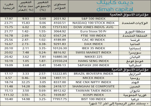«ديمه كابيتال»: المؤشرات القياسية أغلقت الأسبوع الماضي عند أعلى مستوياتها على الإطلاق