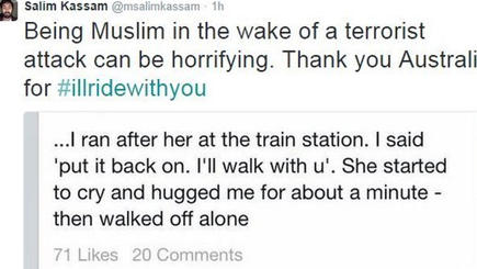 دشن عدد من الأستراليين على موقع “تويتر” الاجتماعي حملة أطلق عليها “سأركب معك”، ليواجهوا بها المشاعر المناهضة للإسلام وللمحجبات، وردود الفعل التى قد تنتج عن هذا الحادث تجاه المسلمين في أستراليا.